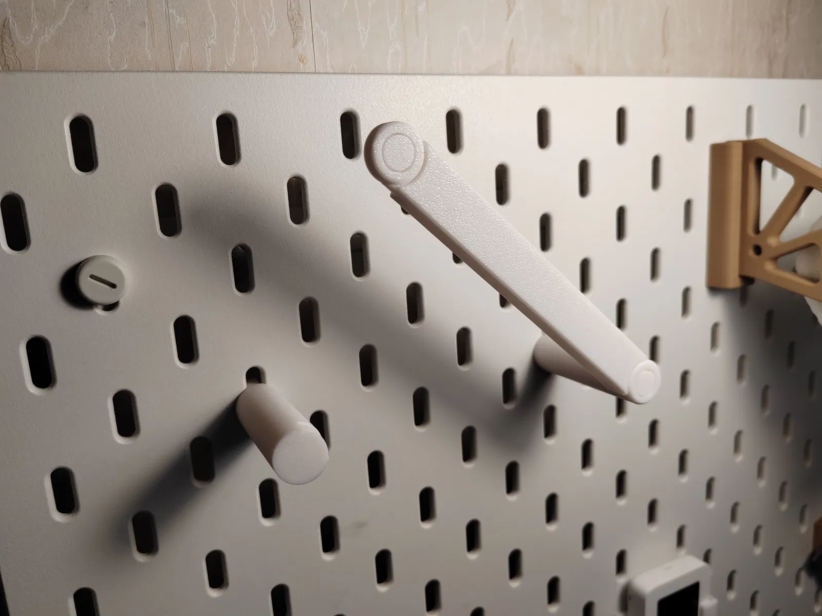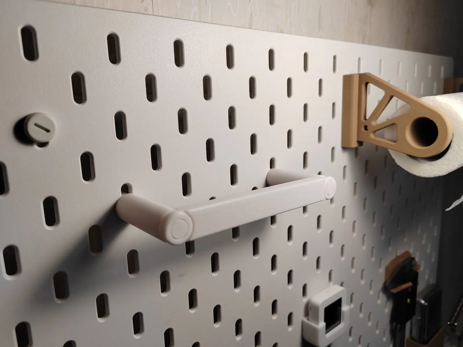 Cái này cũng giống như mấy cái thiết kế khác của tui, cố gắng giữ cho nó đơn giản nhất có thể. Vậy nên, đây nè. Mô hình này giữ được hai cuộn băng keo trên bảng Skadis và rất dễ sử dụng, nhờ có cái bản lề có thể bật lên. Tui nghĩ là sẽ cần dùng support ở phần mái của bản lề và cái chốt giữ mô hình trên bảng Skadis đó.