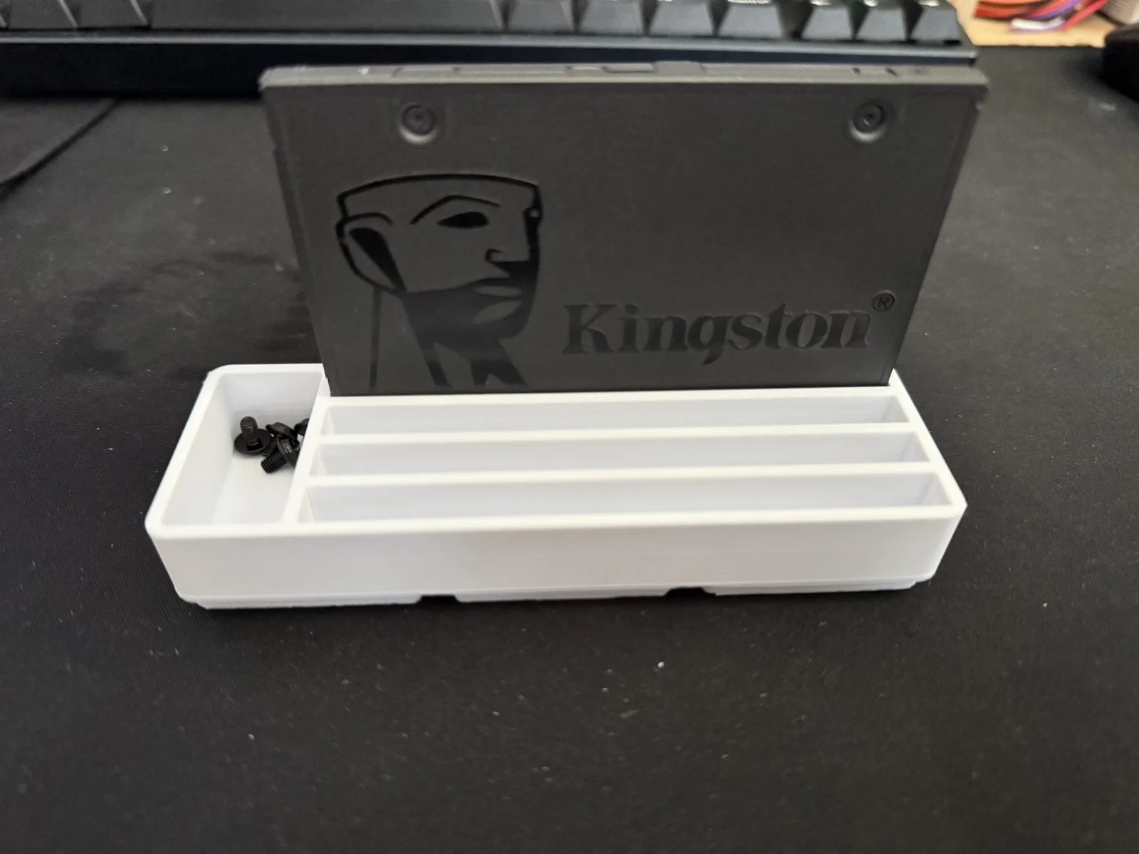 Module Gridfinity 1x3 độc đáo, được thiết kế để chứa 4 ổ SSD kích thước 7mm. Ngoài ra, còn có một ngăn riêng biệt để cất giữ ốc vít đi kèm. Thiết kế phẳng tối ưu cho việc xếp chồng và đồng bộ về chiều cao với các module Gridfinity khác, tạo nên một không gian làm việc gọn gàng và thẩm mỹ.