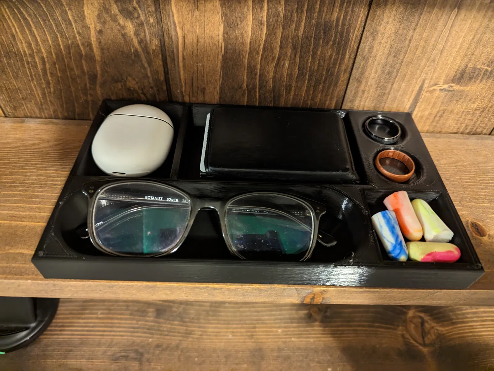 Tự tay làm khay đựng đồ đầu giường độc đáo, có ngăn riêng cho ví, mắt kính, tai nghe, nhẫn và tiền lẻ/nút bịt tai. In đẹp bằng PLA, đầu phun 0.4-0.6mm, độ cao lớp cắt 0.2mm.