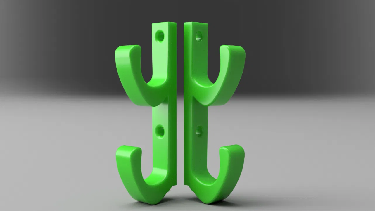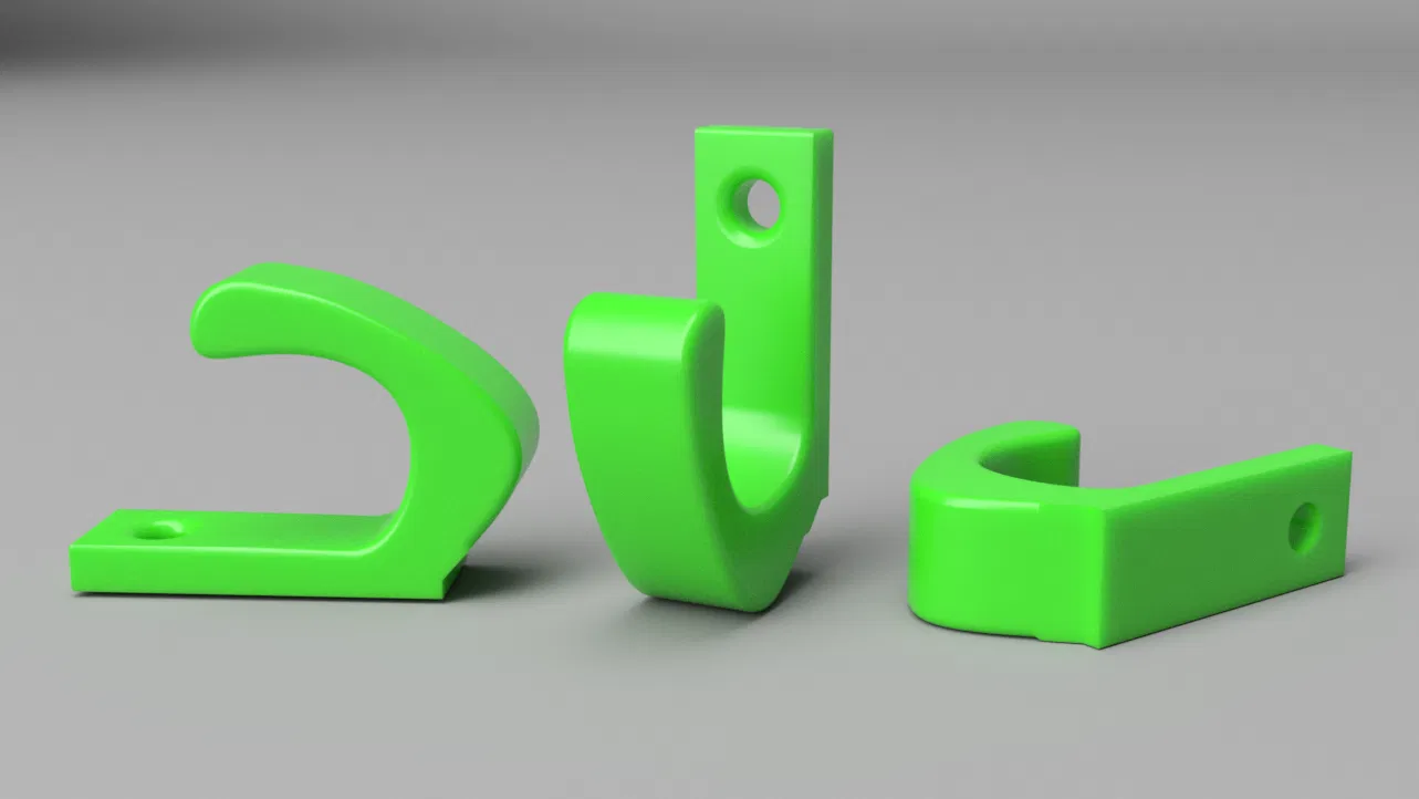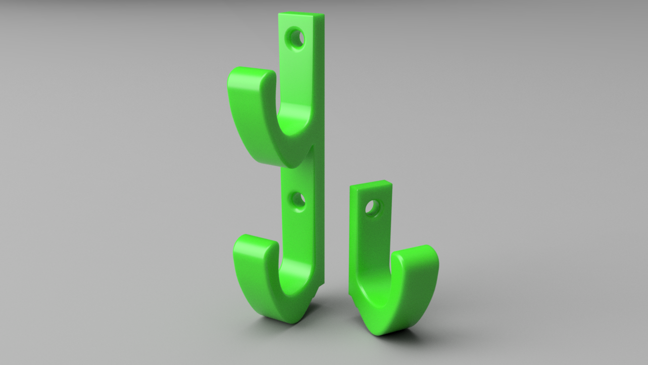 Móc treo tường đơn hoặc đôi, thiết kế chắc chắn. Phiên bản đầu tiên cần mũi khoan size 10, phiên bản sau sẽ được cải tiến với lỗ khoan nhỏ hơn. Có ghi chú cải tiến đế cho bản v2.