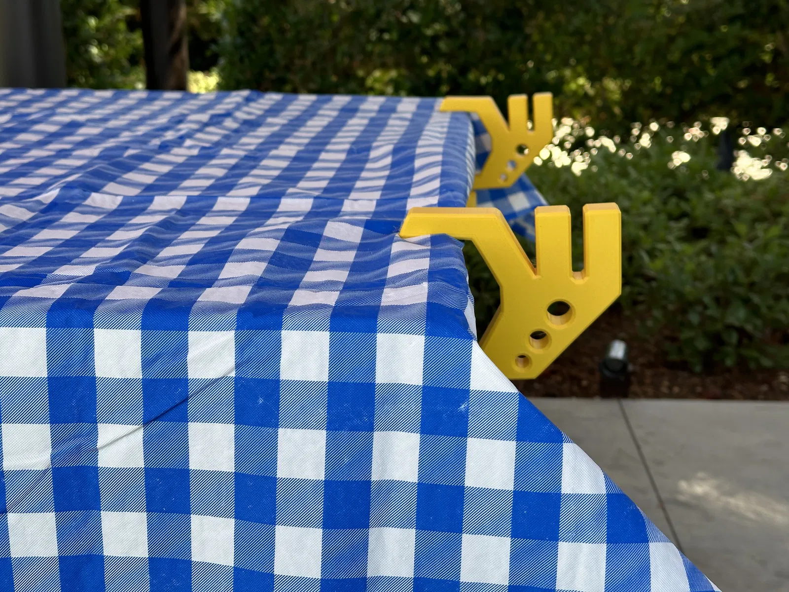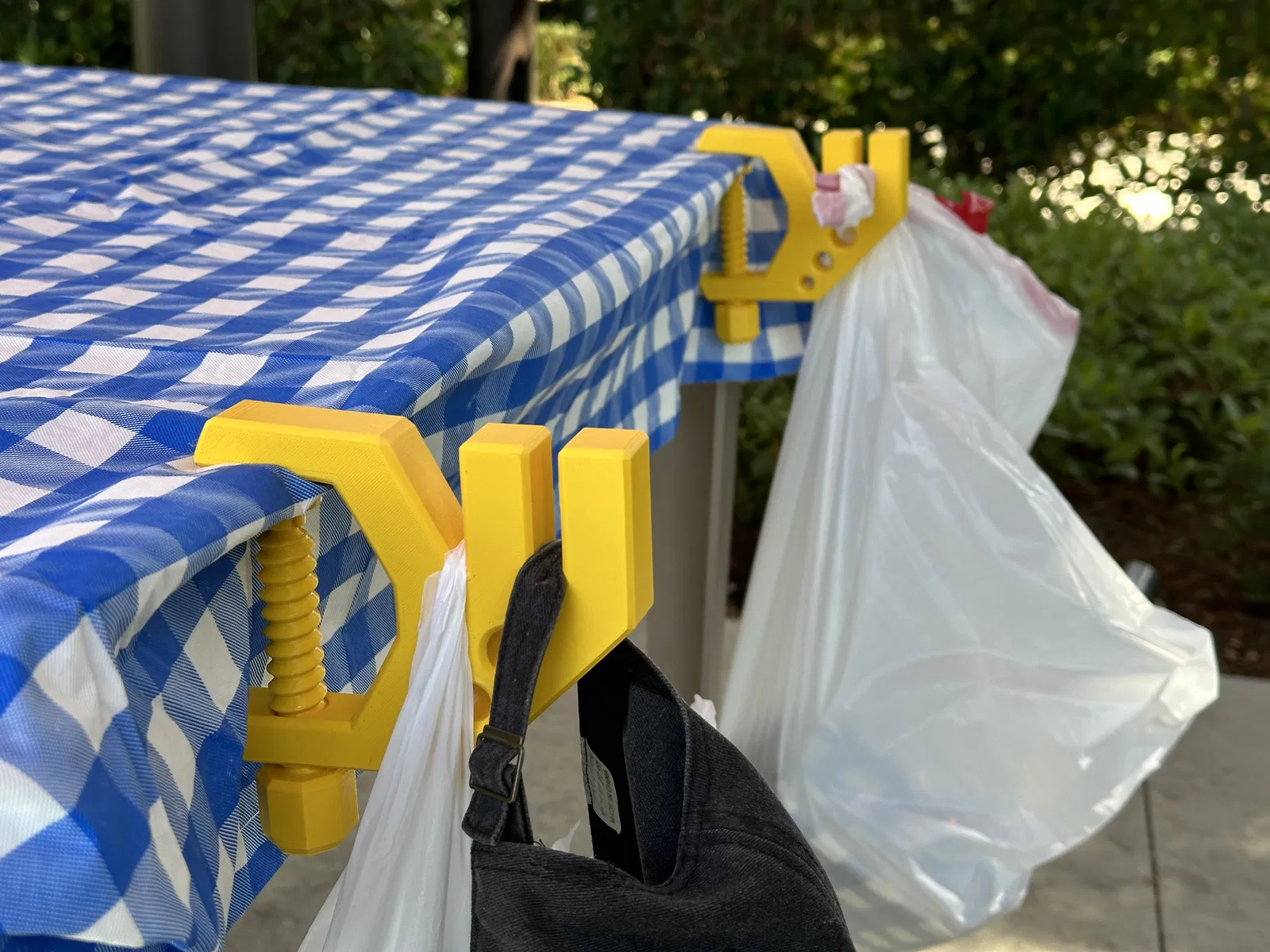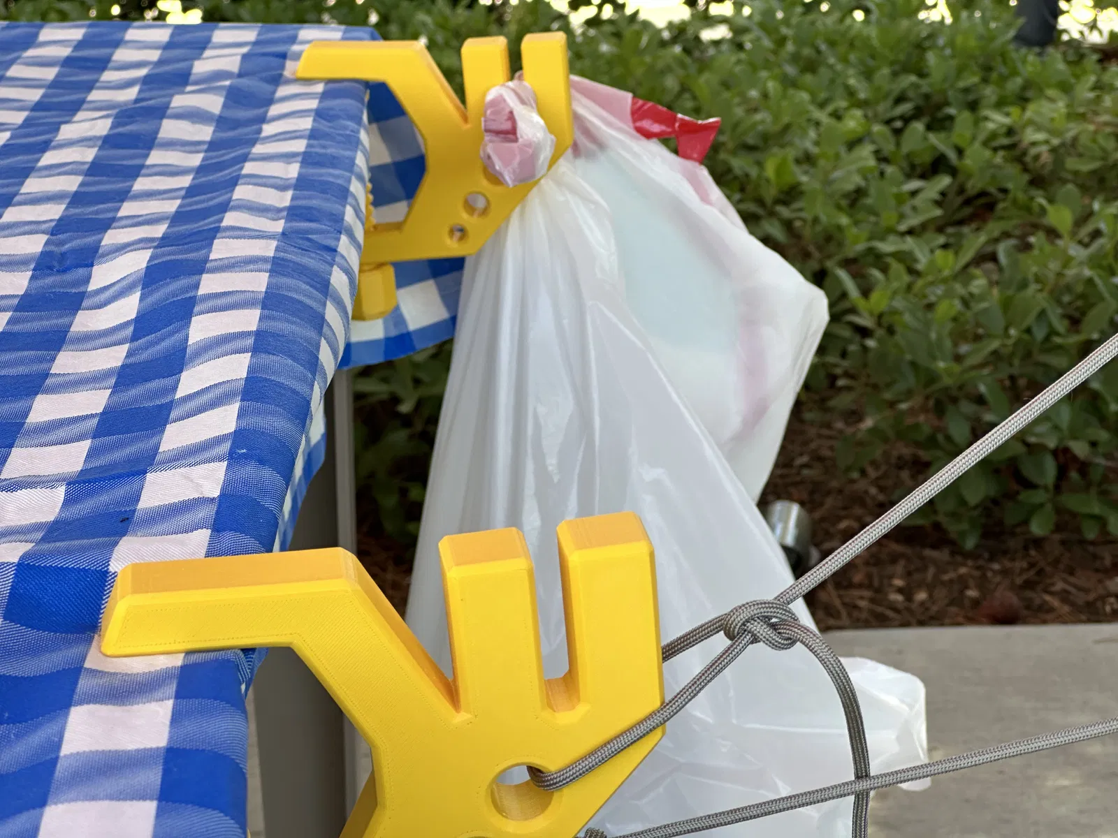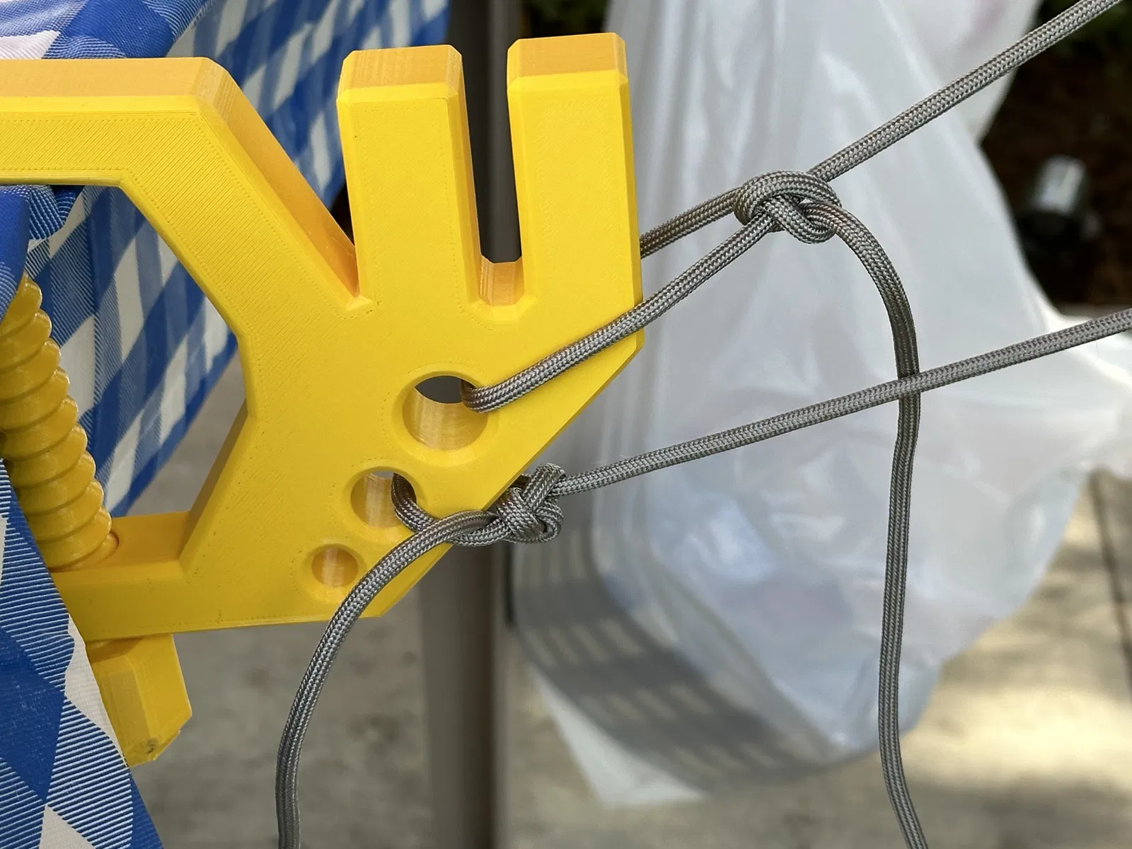 Cái kẹp này sẽ giữ khăn trải bàn của bạn ở đúng chỗ. Bạn có thể buộc nút hai cái túi rác rồi treo chúng vào khe để đựng đồ tái chế và rác thải. Hoặc bạn có thể dùng khe này để treo khăn rửa chén (có thể bạn cũng cần buộc nút). Dùng để buộc dây thừng hoặc dây dù cho một đầu dây phơi quần áo. Cái Kẹp Cắm Trại này có nhiều công dụng lắm! Có khoảng hở 0.2mm giữa ốc và khung, cái này thì hầu hết các máy in đều xài được. Đừng scale mẫu này nhỏ lại nha, vì có thể làm ren bị kẹt.