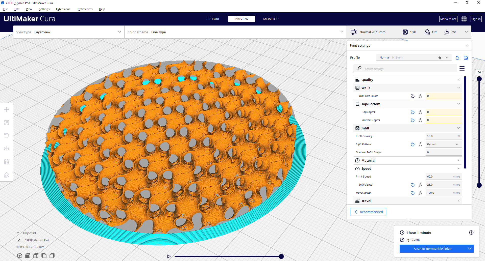 Tạo ra một miếng đệm siêu mềm và đã tay bằng cách bỏ hết các lớp tường, trên, dưới và sử dụng mẫu lưới Gyroid với TPU. Tùy chỉnh mật độ lưới để đạt độ mềm hoặc độ dày mong muốn. Cài đặt tốc độ in chậm để đạt kết quả tốt nhất với TPU.