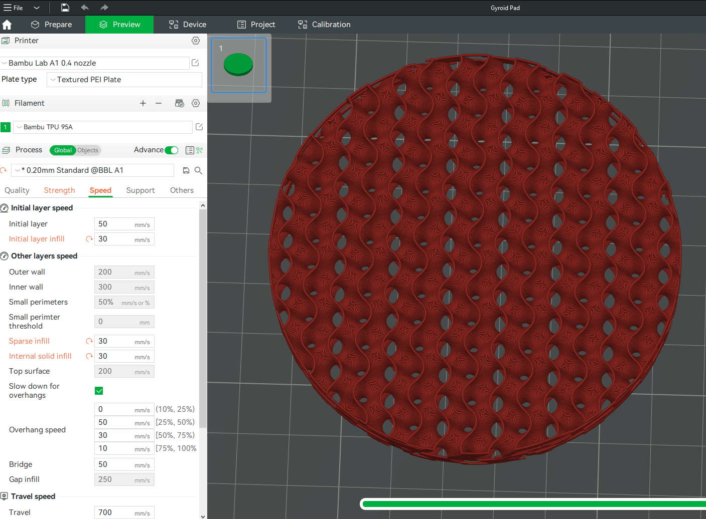 (Chỉ có tốc độ lưới là thực sự quan trọng, vì đó là tất cả những gì bạn in; tuy nhiên, hãy đặt chúng thật chậm, vì TPU cần tốc độ chậm để in)