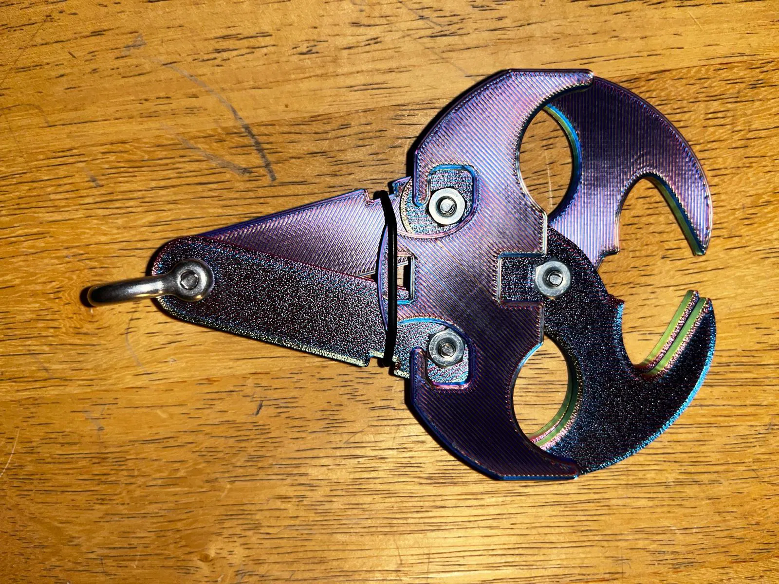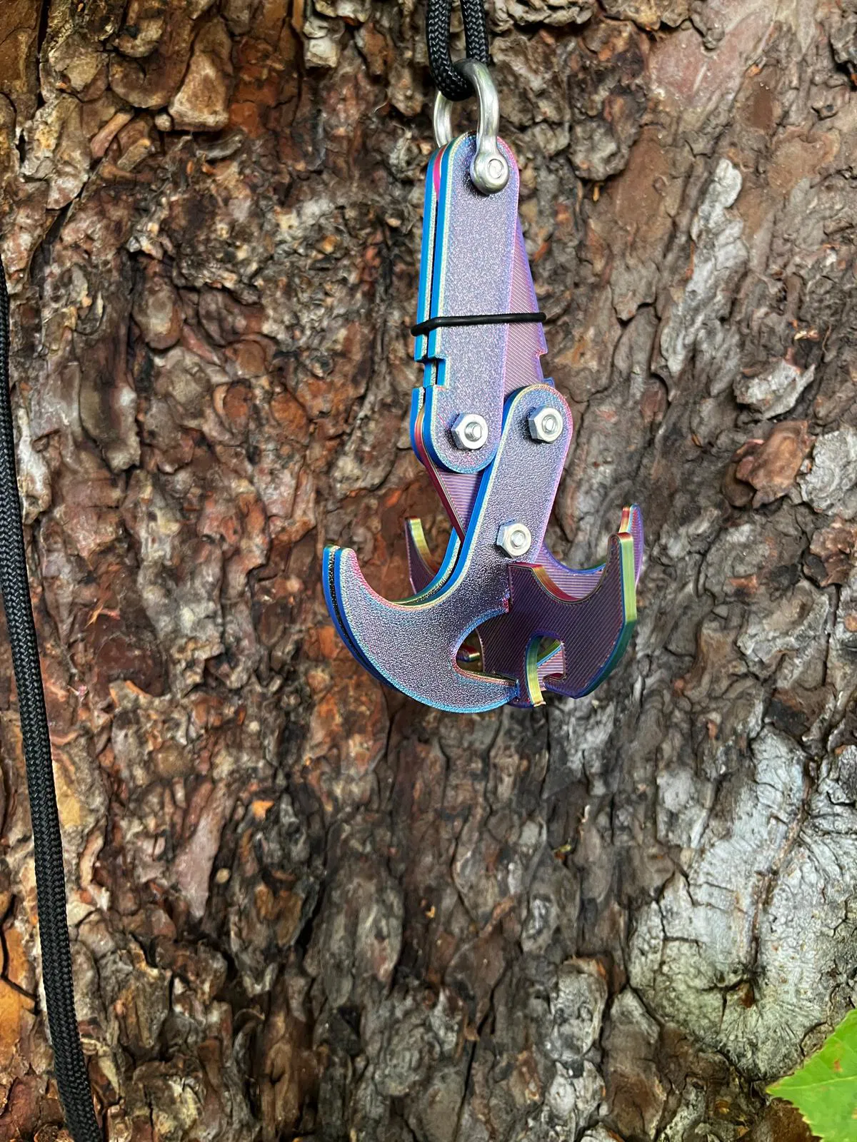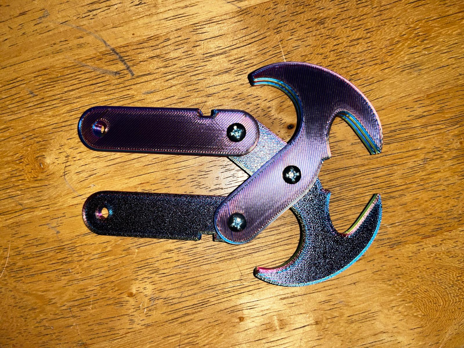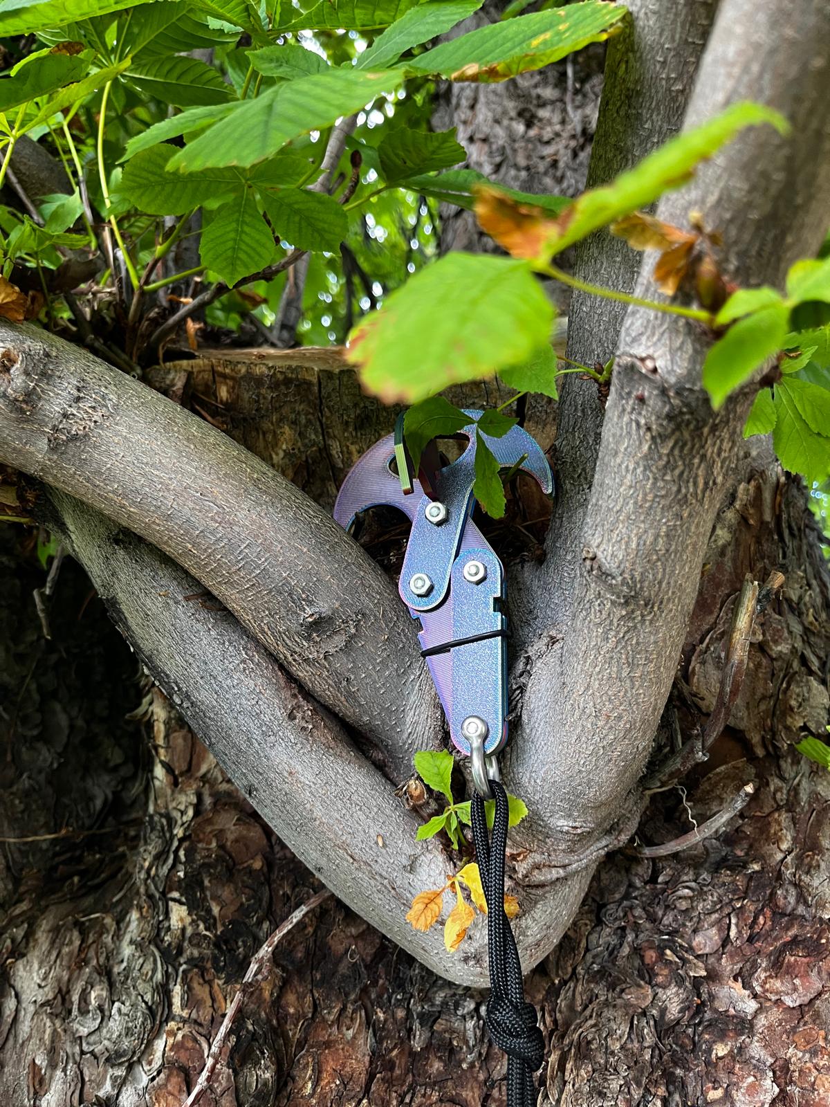 Móc trọng lực → Móc neo: Để chuyển đổi móc trọng lực thành móc neo, chỉ cần lắp bộ phận “móc chữ thập” vào các hàm của móc trọng lực, và các đầu của “cánh tay trên” sẽ đi qua lỗ hình chữ nhật ở “móc chữ thập”, do đó neo chặt “móc chữ thập” vào đúng vị trí miễn là móc trọng lực đang đóng. Nó có thể được giữ đóng bằng dây chun quấn quanh các rãnh ở “cánh tay dưới”. Ngoài ra, tôi chỉ dùng một vòng O có sẵn quanh đó như bạn thấy trong hình dưới đây.