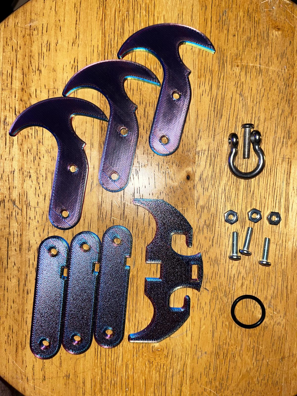 Phần cứng: 3x Vít và đai ốc #8-0.5" 1x Chốt neo hình chốt (Tôi tìm thấy cái này trên Amazon: https://a.co/d/d2lQfPU) 1x Dây chun hoặc Vòng O (tùy chọn, chỉ dùng với Móc chữ thập để giữ nó cố định.)