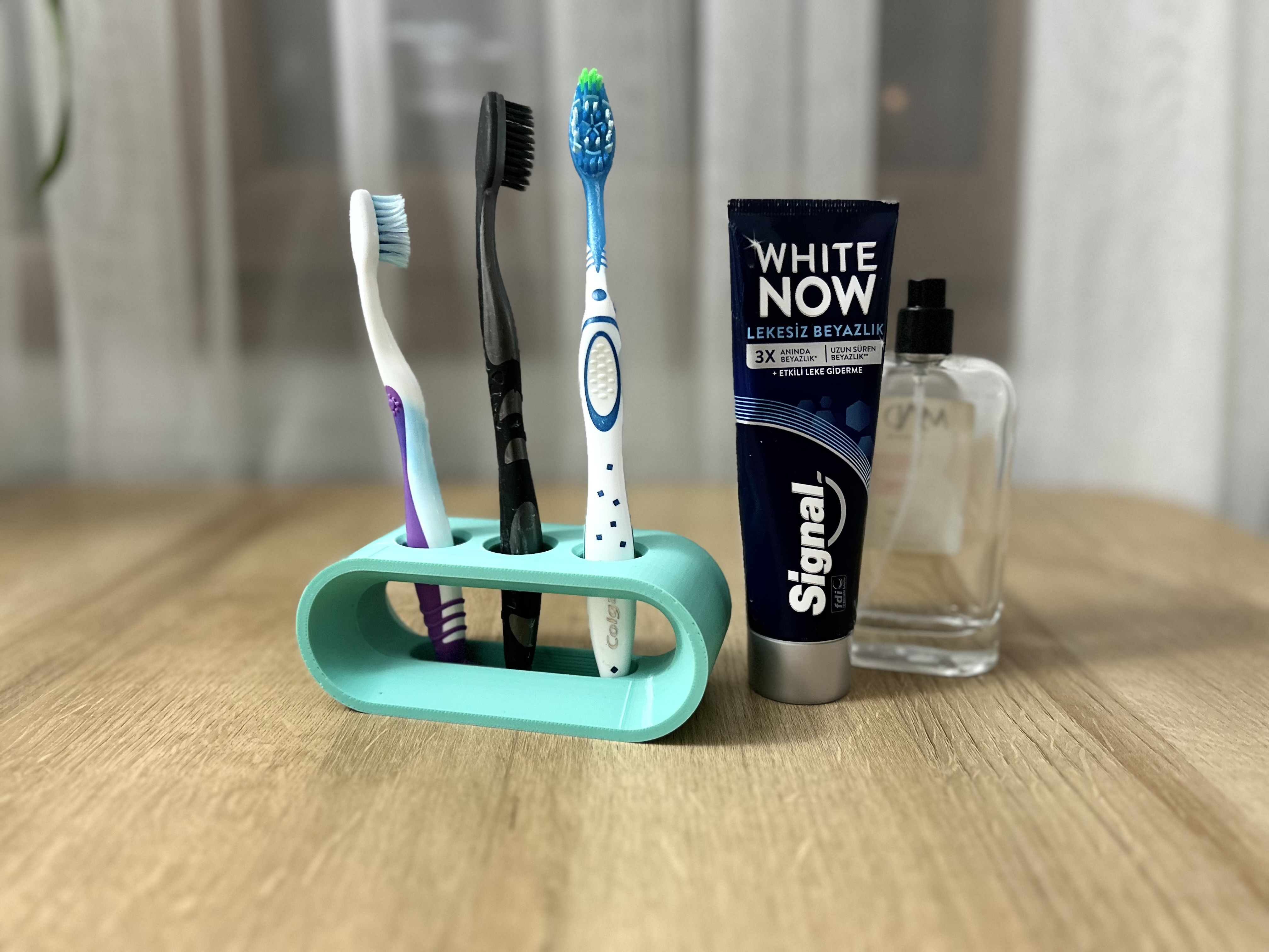 Cái này có thể để được 3 bàn chải đánh răng tiêu chuẩn, đường kính lỗ trên 20 mm. Kích thước tổng thể của đế là 128x50x50 mm, rất thích hợp để trong phòng tắm.