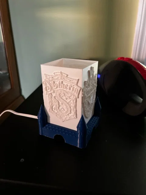 Con gái tui muốn có đèn ngủ nên tui thiết kế đèn bàn Hogwarts này. Phần đế tui tự làm, chao đèn in bằng PLA trắng hoặc phát quang. Đèn bắt buộc dùng LED vì đèn sợi đốt nóng lắm.