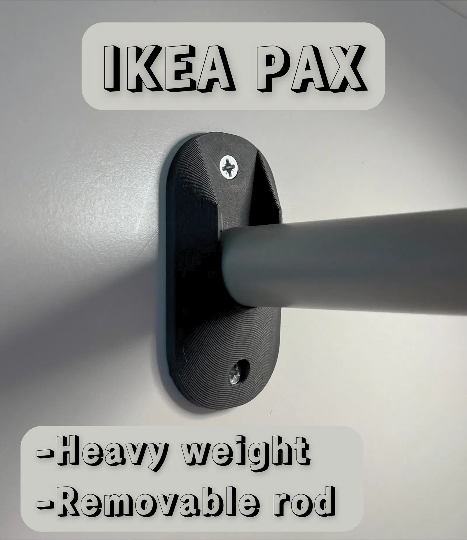 Có 3 mẫu giá đỡ thanh 25 mm cho tủ quần áo, tùy theo loại vít bạn muốn dùng để gắn: vít IKEA PAX, vít chìm, hoặc vít đầu tròn. Khoảng cách lỗ khoan theo chuẩn IKEA PAX. Chất liệu in: PLA, định dạng file: STL.