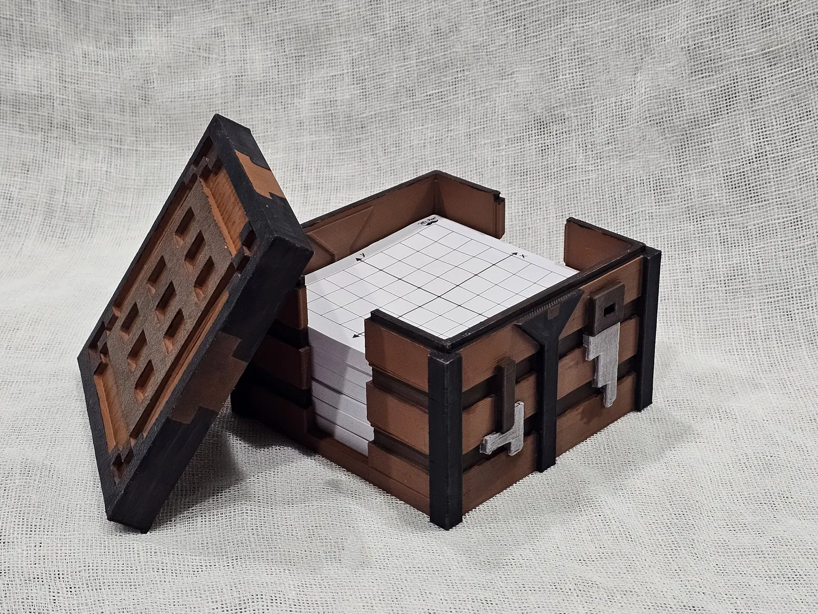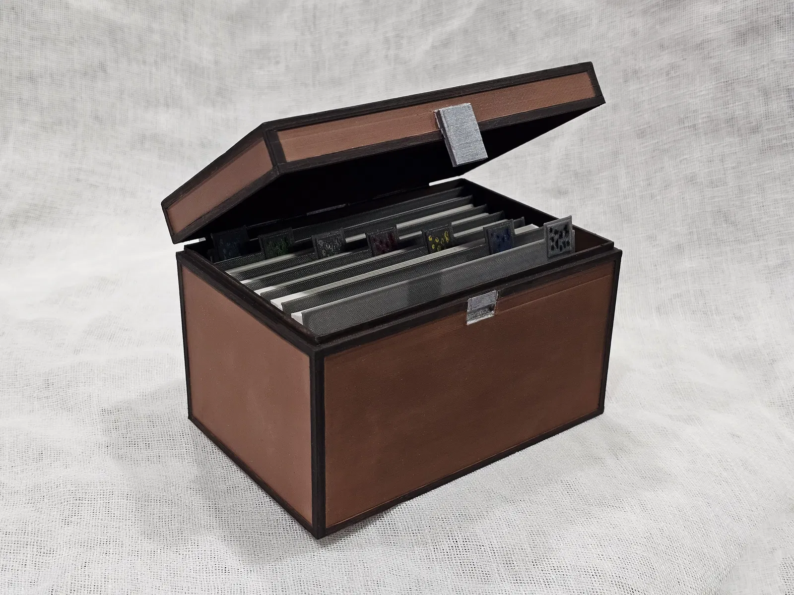 - Ghi chú: Do có gờ trên nắp, tốt nhất nên bật hỗ trợ khi in phần trên. Nó không cần thiết cho máy in của tôi nhưng tôi đã có một số bị sụp xuống và các đường không đều. Tô màu không đơn giản để tạo lớp, nhưng rất dễ in màu nâu và tô điểm bằng bút tô màu bạc và nâu sẫm. Nắp thanh không cần thiết nếu vừa khít, nhưng là tùy chọn cho độ bền tối đa.
