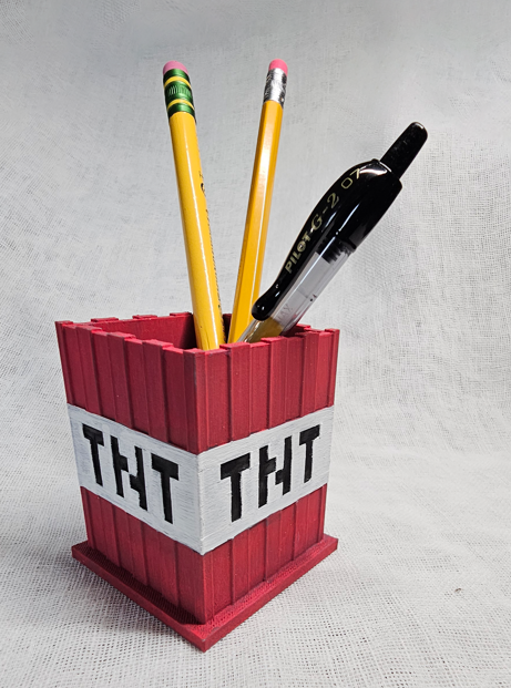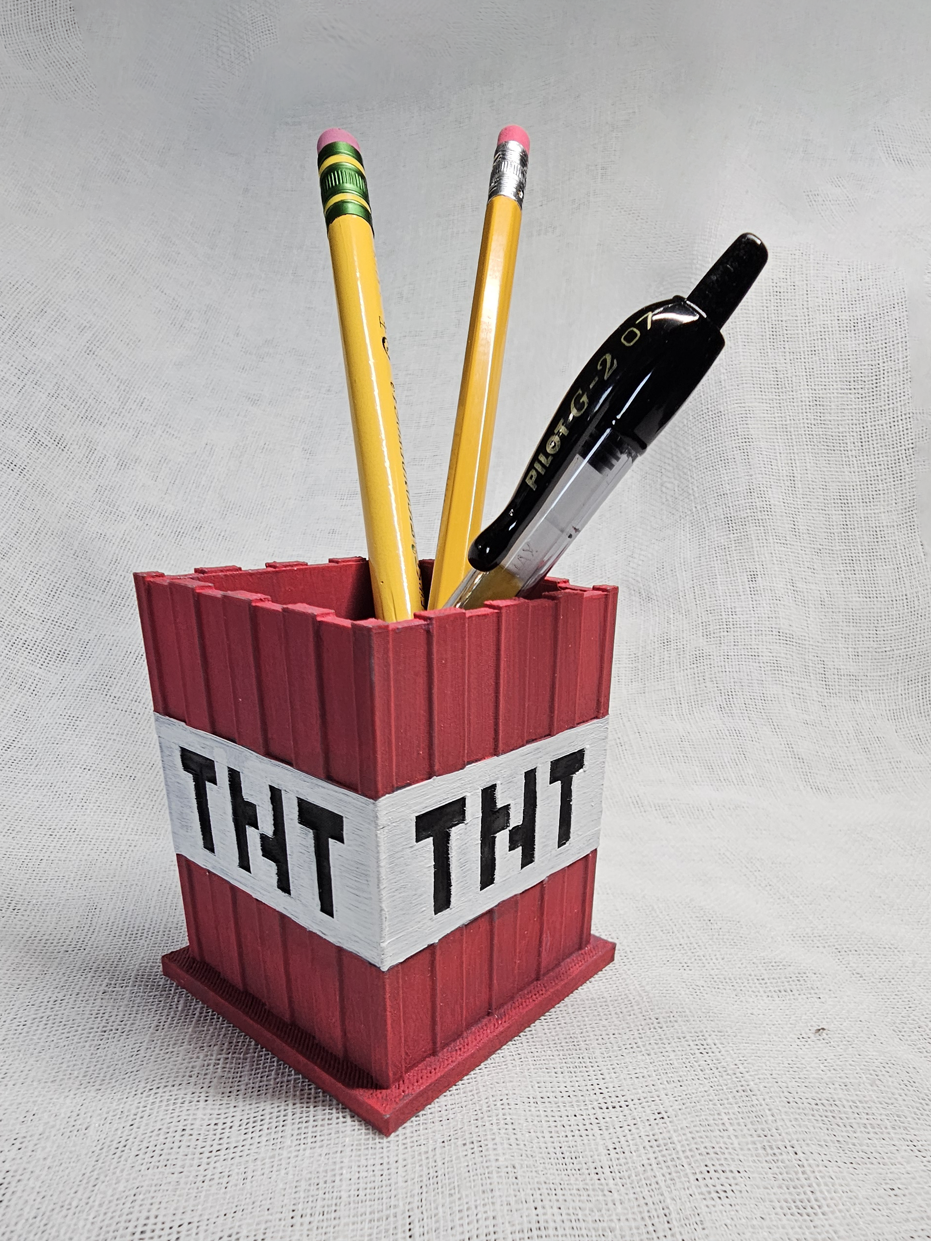 • Ghi chú: Thật không may, cái này không dễ in nhiều màu. Có thể cắt lớp đỏ ở dưới cùng và trên cùng với lớp trắng ở giữa, nhưng sẽ cần bút tô màu đen để chi tiết các chữ cái. Cả hai đều in theo hướng tiêu chuẩn mà không cần hỗ trợ - phiên bản ngắn hơn giống khối lập phương hơn nhưng sẽ không giữ bút chì tốt bằng. Đáy bên trong có họa tiết dây cháy từ đỉnh của khối TNT trong trò chơi.