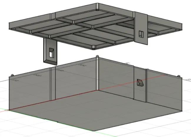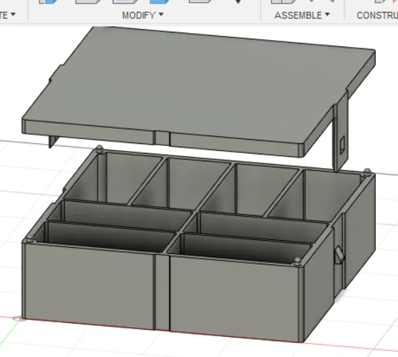 Đây là thiết kế của tui cho một hộp đựng đồ cơ bản. Nó có mấy cái kẹp để đóng nắp hộp lại cho kín. Kích thước tổng thể của hộp là 200mm x 204mm x 65mm (cả phần đế (55mm) và nắp (10mm) cộng lại). Có bốn ngăn có kích thước 42mm x 93.5mm và bốn ngăn kia kích thước 45.25mm x 100mm. Không cần support nếu lật nắp lại khi slice. Có sẵn 1mm dung sai. Tui không rành cài đặt in ấn lắm, nhưng chắc cài đặt thông thường là xài được.