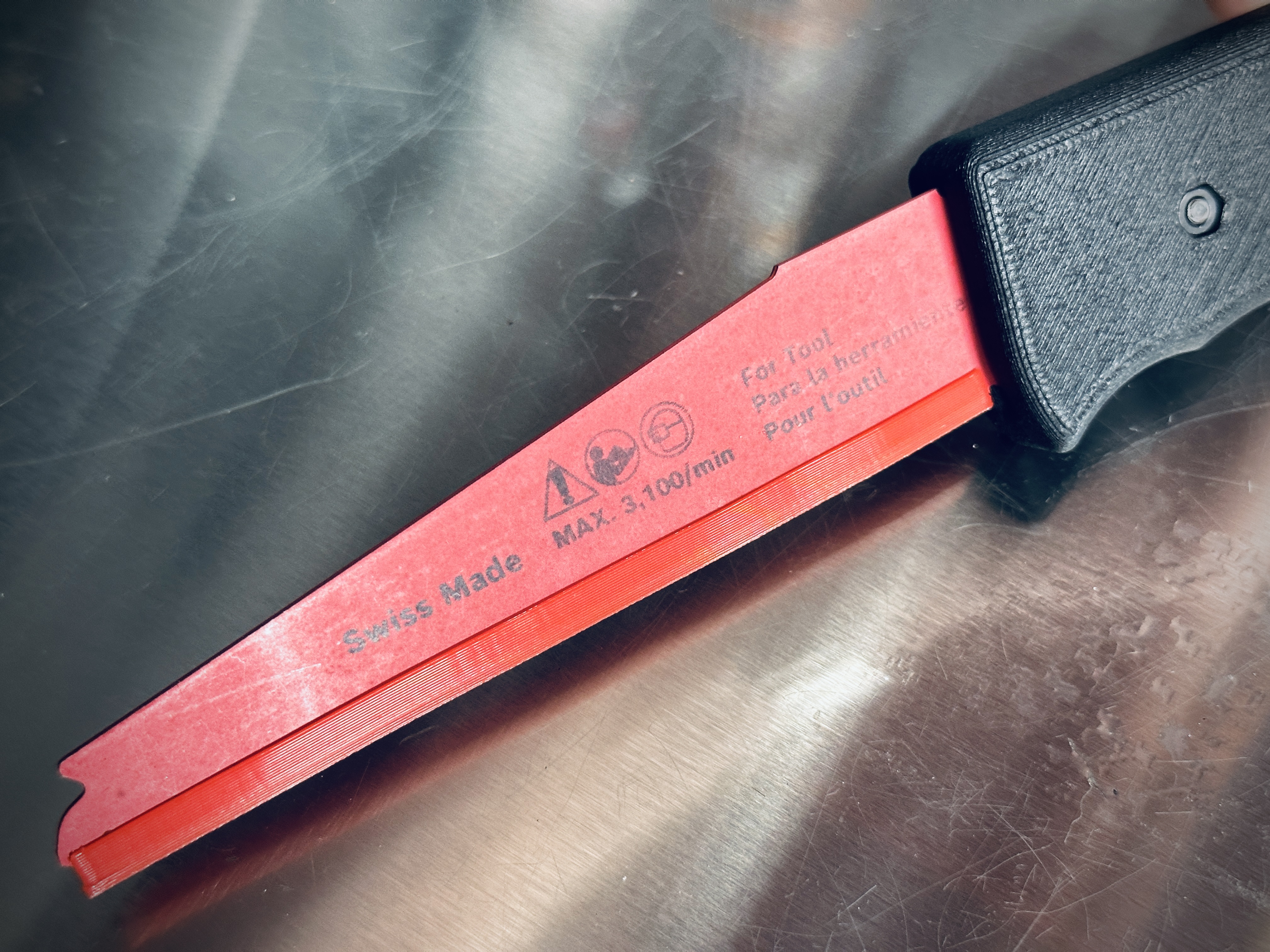 Tôi đã thử một cái thứ hai bằng PLA+ nhưng nó bị bung ra dọc theo các đường lớp do ứng suất. Tôi khuyên bạn nên điều chỉnh kích thước tăng lên một hoặc ba phần trăm nếu cần. Tất nhiên, bạn có thể thay đổi tỷ lệ tổng chiều dài để phù hợp với lưỡi dao dài hơn — hoặc nếu bạn viết bình luận hoặc nhắn tin riêng, tôi có thể làm theo yêu cầu của bạn.