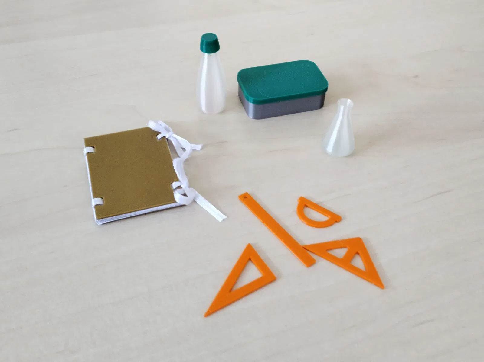 Trở lại trường học với bộ phụ kiện mini "Phụ kiện trường học tí hon"! Bộ sưu tập bao gồm thước kẻ, cốc hóa chất, chai nước, hộp cơm, kẹp giấy và bảng màu. Sản phẩm được in từ PLA, không cần support, độ dày lớp cắt 0.2 mm, có kèm giấy ghi chú. Thích hợp cho búp bê, nhà búp bê và các dự án mini khác.