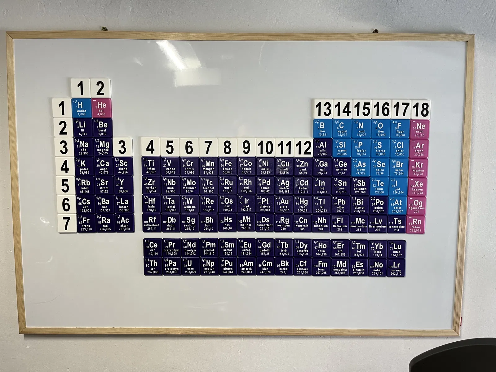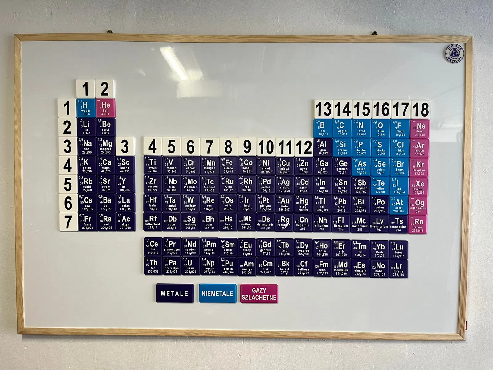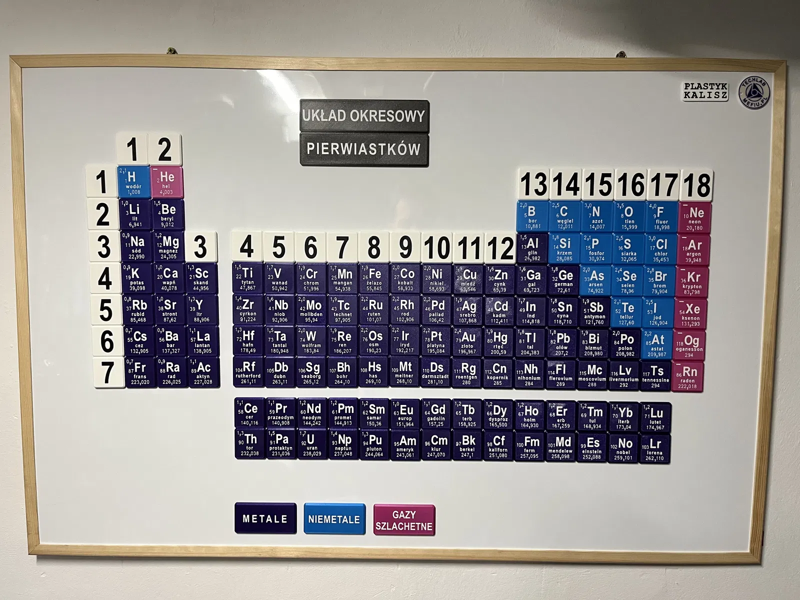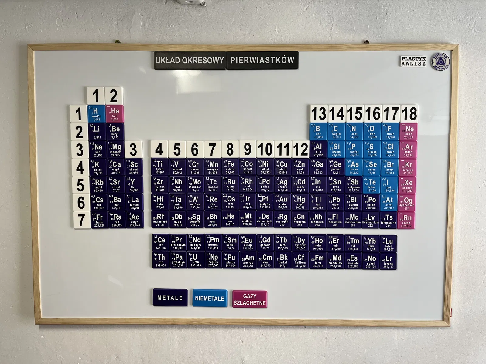 Bảng tuần hoàn các nguyên tố phiên bản tiếng Ba Lan (PL). Khuyến khích dùng nam châm tự dính kích thước 20x2mm để treo trên bảng. Kích thước bảng 120x90cm, mỗi ô nguyên tố 5x5cm. Một mô hình giáo dục hay cho trường học!