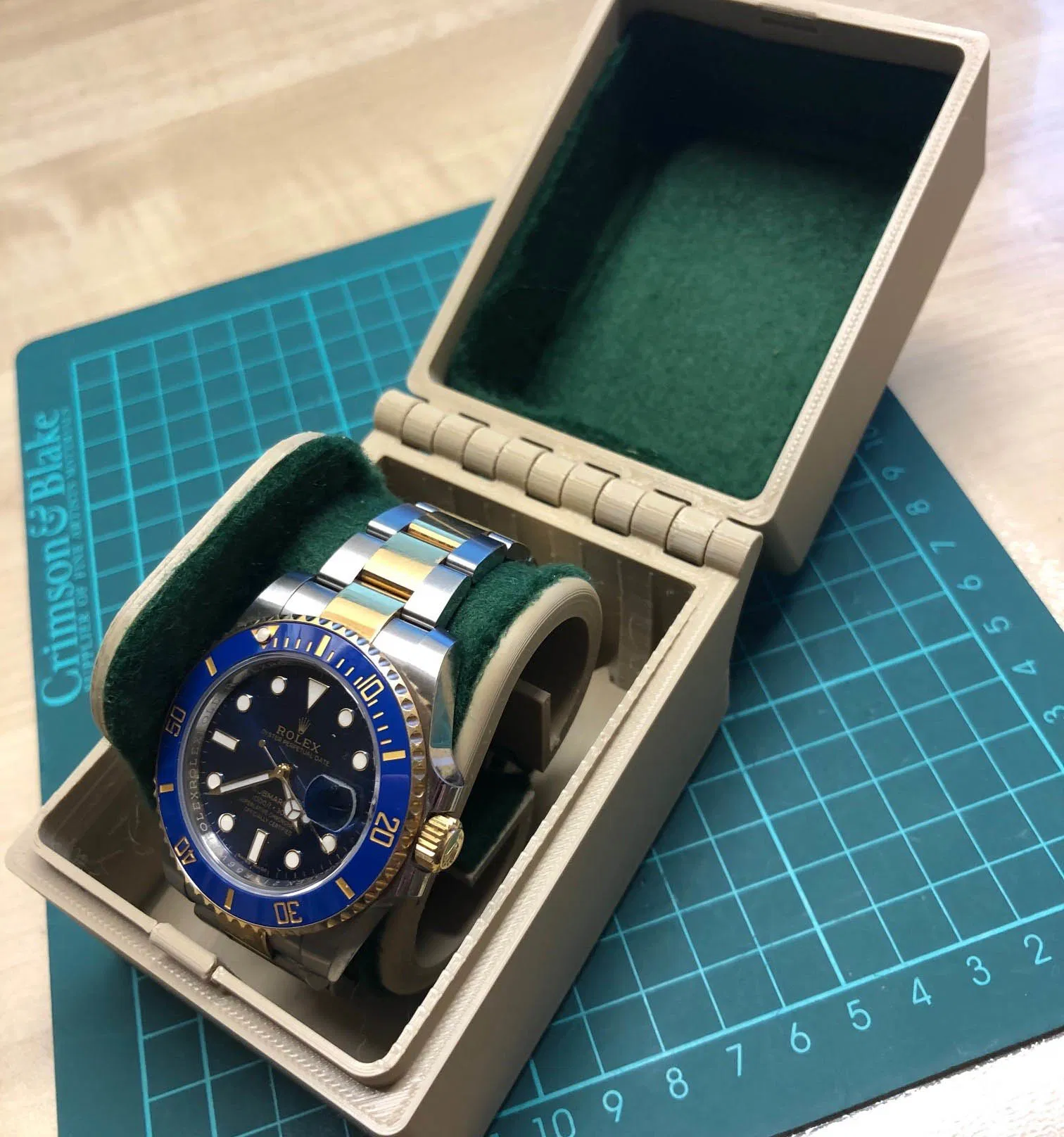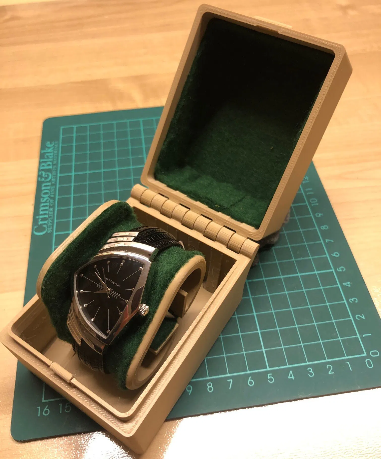 Đây là hộp đựng (và chân đế trưng bày tích hợp) dạng vỏ sò cho đồng hồ đeo tay có mặt lên đến 45mm (bạn có thể di chuyển tâm chân đế để chứa đến 55mm). Hộp có bản lề 8mm chắc chắn (in sẵn trong một khối) và thành dày 3mm, nên vừa có tính bảo vệ chứ không chỉ để trang trí. Trong trường hợp này, hộp được làm từ PLA+30% gỗ; nó có thể được làm từ PETG hoặc Nylon để bền hơn. Đối với hộp này, tôi đã thêm một logo để bổ sung cho chiếc đồng hồ Hamilton được đặt bên trong (có file STL kèm theo). Bạn có thể tùy ý tạo phần nắp trên theo ý muốn. Bên trong lót vải nỉ tự dính, dễ mua để bảo vệ đồng hồ một cách tối đa. Hộp có thiết kế vỏ sò. Kích thước ngoài R75 x D100 (tính cả bản lề) x C80mm.