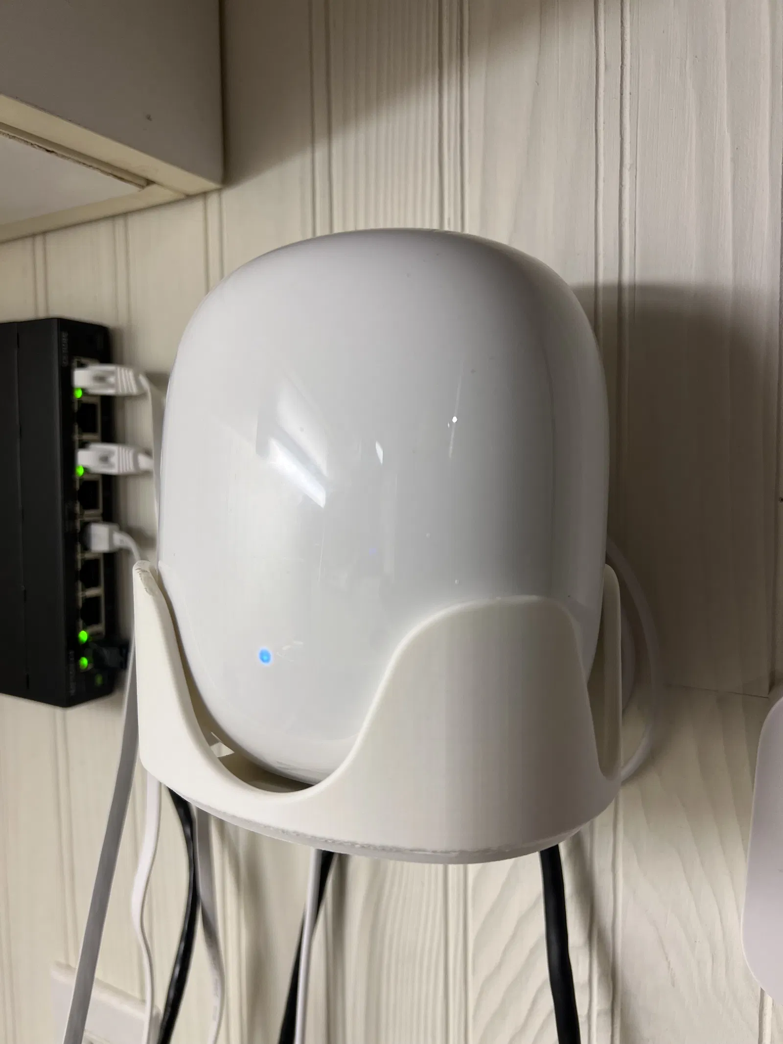 Giá treo tường Google Nest WIFI Pro-6E, giúp bạn dễ dàng gắn thiết bị lên tường bằng 2 vít #10 và cất gọn dây nguồn. Bản demo in bằng PLA với 3 lớp tường, 15% độ đặc.