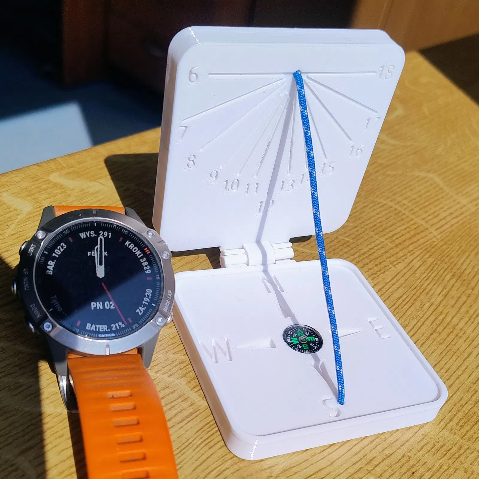 Các nửa của mô hình cần được in riêng. Sau đó, chúng ta nhẹ nhàng nối các bộ phận lại với nhau bằng bản lề (mình lấy cảm hứng từ mẫu bản lề: của Haniel). Bạn có thể làm ấm nhẹ bộ phận bằng máy sấy tóc để nó mềm dẻo hơn. Chúng ta luồn dây/sợi dây qua các lỗ và buộc lại sao cho khi mở ra, hai nửa nghiêng với nhau một góc vuông. Chúng ta lắp la bàn có đường kính 15 mm vào lỗ ở đế. Bạn cũng có thể định hướng đồng hồ Mặt Trời bằng la bàn bên ngoài (vì trong 10 chiếc la bàn nhỏ mình mua trên Amazon, chỉ có một chiếc chỉ đúng hướng Bắc :-)). Chúng ta định hướng đồng hồ Mặt Trời về phía Bắc và đọc thời gian. Đây là phương pháp gần đúng, không tính đến các hiệu chỉnh do vị trí địa lý hoặc cái gọi là phương trình thời gian. Tuy nhiên, nó đủ để sử dụng trong chuyến đi cắm trại hoặc ở trường. Chúc các bạn vui vẻ!