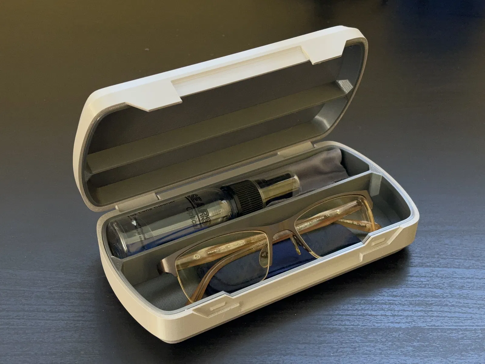 Giải pháp lưu trữ toàn diện cho kính cận, bao gồm cả không gian dành riêng cho phụ kiện vệ sinh kính. Được thiết kế tối ưu cho việc in 3D với các vật liệu PETG và TPU.