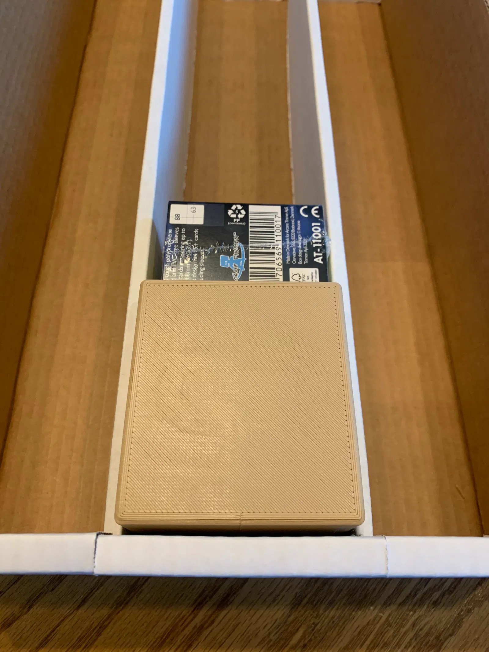 Trong hộp 100 lá, có đủ chiều dài để vừa với các toploader. Với bộ bài đã được bọc trong sleeve, bạn có thể nhét vừa 2 chiếc, nhưng nếu bạn có một tấm chia bài dày thì có thể sẽ mất đi một chút không gian lưu trữ riêng biệt.