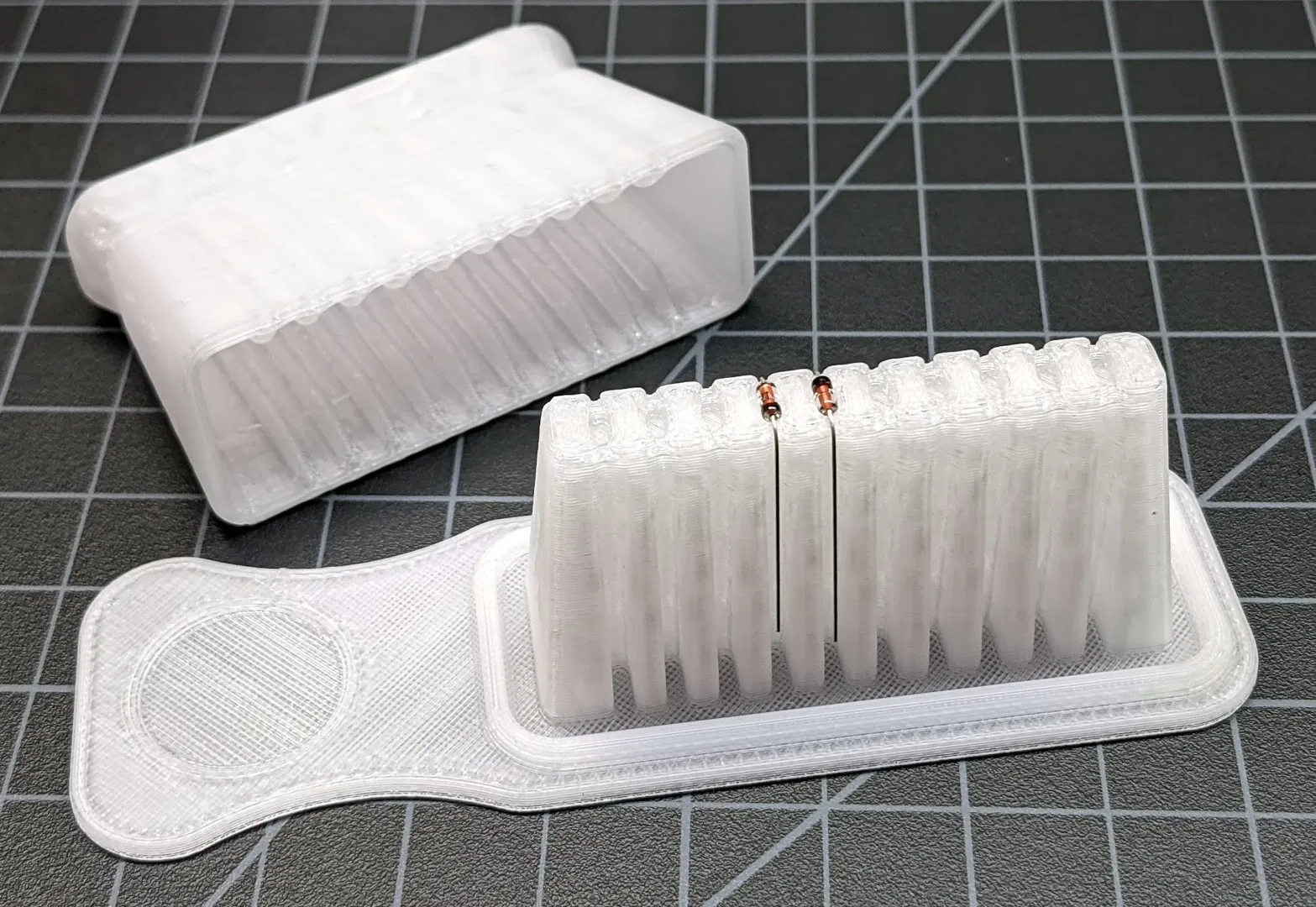 Tui thiết kế cái này để uốn nhiều diode cùng lúc cho mấy bộ kit bàn phím cơ mà tui đang ráp. Cái này giúp mấy cái bend nó đều nhau, nhìn cho đẹp mấy cái mạch mà linh kiện lộ ra ngoài. Nó cũng tiện nữa là có thể uốn 12 cái cùng lúc nếu bạn có nhiều cái để làm.