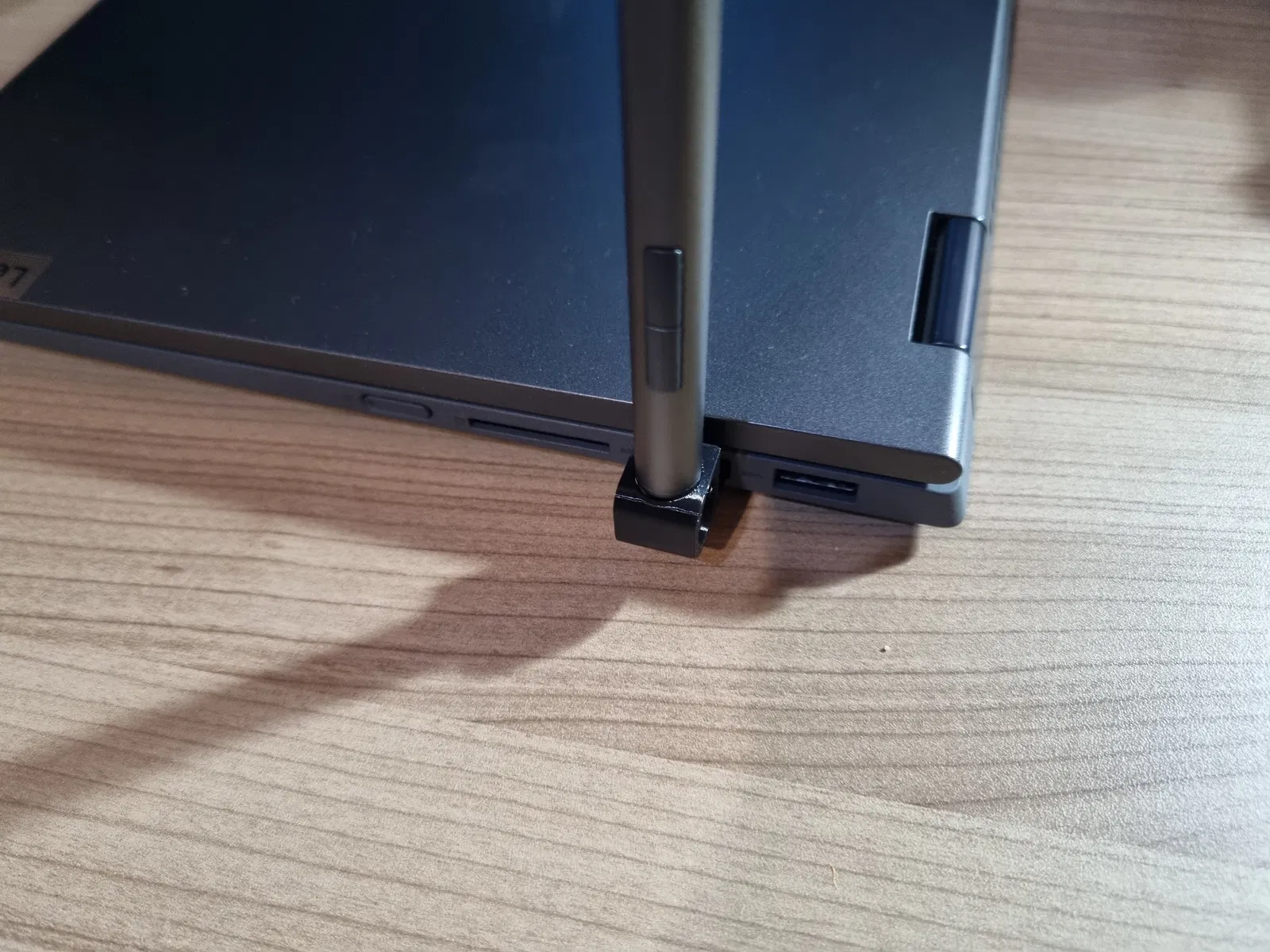 Cái lỗ bên hông để cắm bút thì nó không đủ bự để vừa mấy cái nút bấm, nên đừng có cố ấn cây bút vô sâu quá nha. Cá nhân tui thì cũng không muốn cắm bút sâu vậy đâu, làm vậy thì đảm bảo nó không bị rớt ra khi di chuyển laptop. Bạn có thể thử chà nhám cho lỗ bự hơn hoặc thêm một cái modifier âm bản (negative volume modifier) trong slicer.