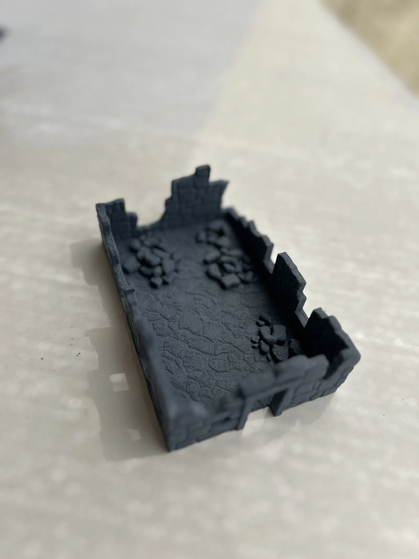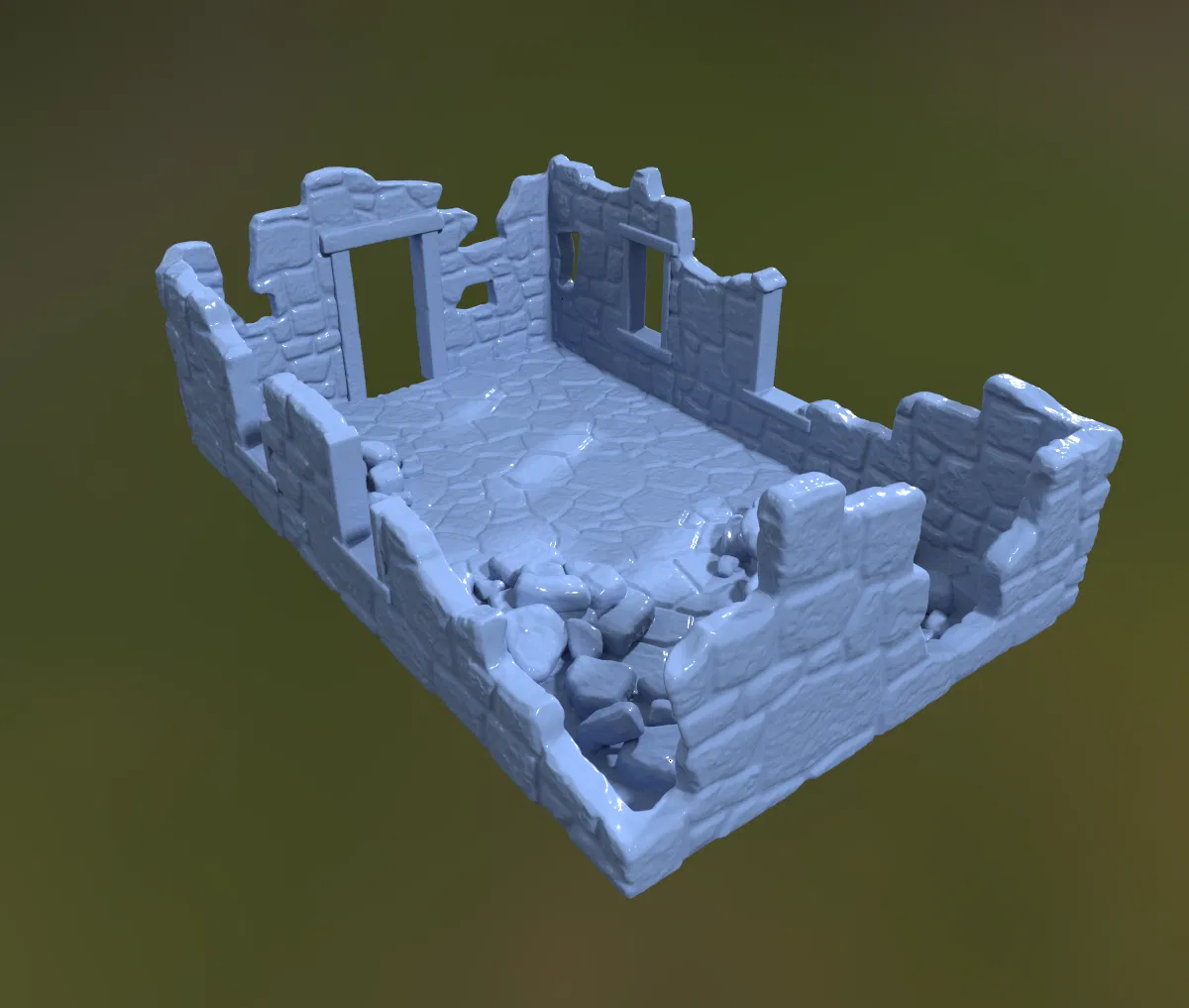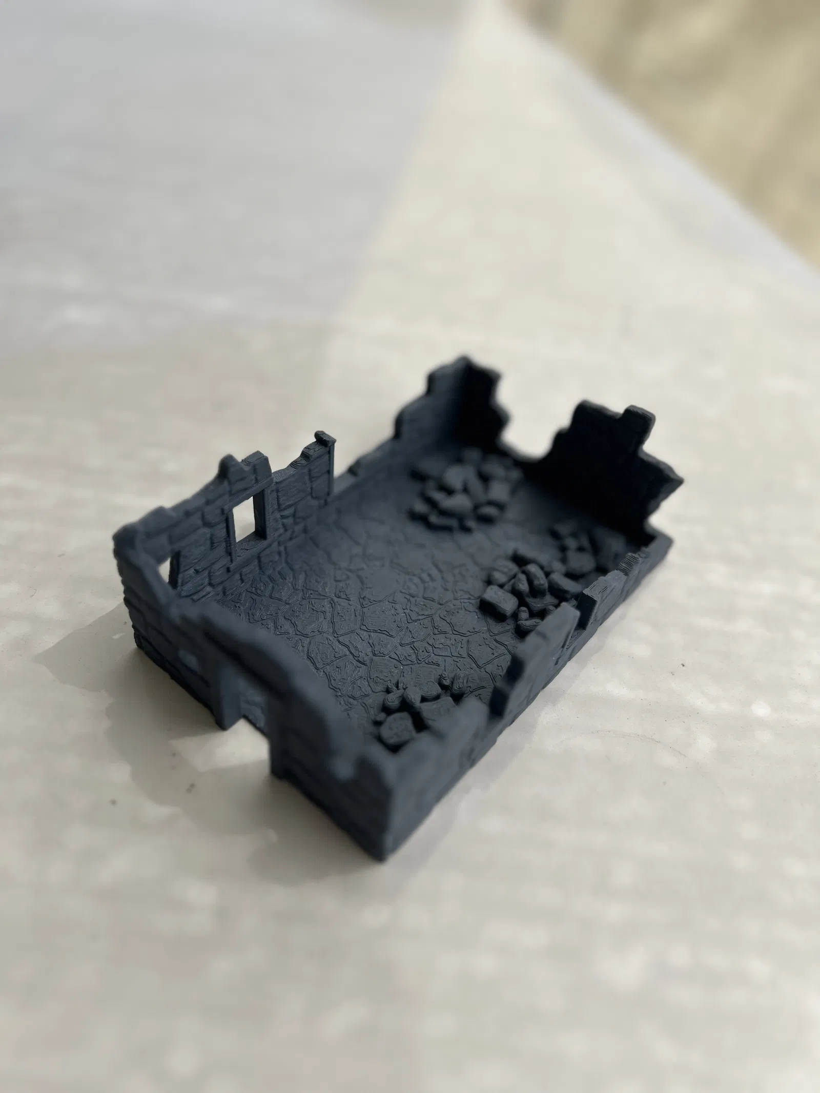Một ngôi nhà nhỏ với những bức tường đổ nát và mảnh vụn vương vãi trên sàn. Thích hợp cho các bàn chơi game, chi tiết sắc sảo, in được bằng FDM và Resin.