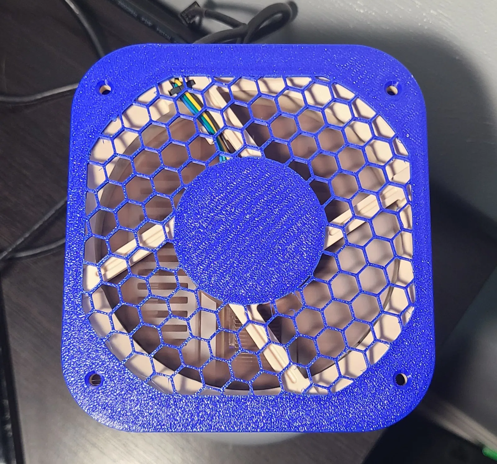 - Đặt quạt vào nắp trên sao cho luồng khí hướng lên trên (về phía lưới) và cắm cáp quạt vào lỗ ở phía sau, lỗ này có kích thước vừa vặn cho mọi loại cáp quạt 3 chân hoặc 4 chân. Đề xuất xoay quạt sao cho cáp nằm gần lỗ hình oval.