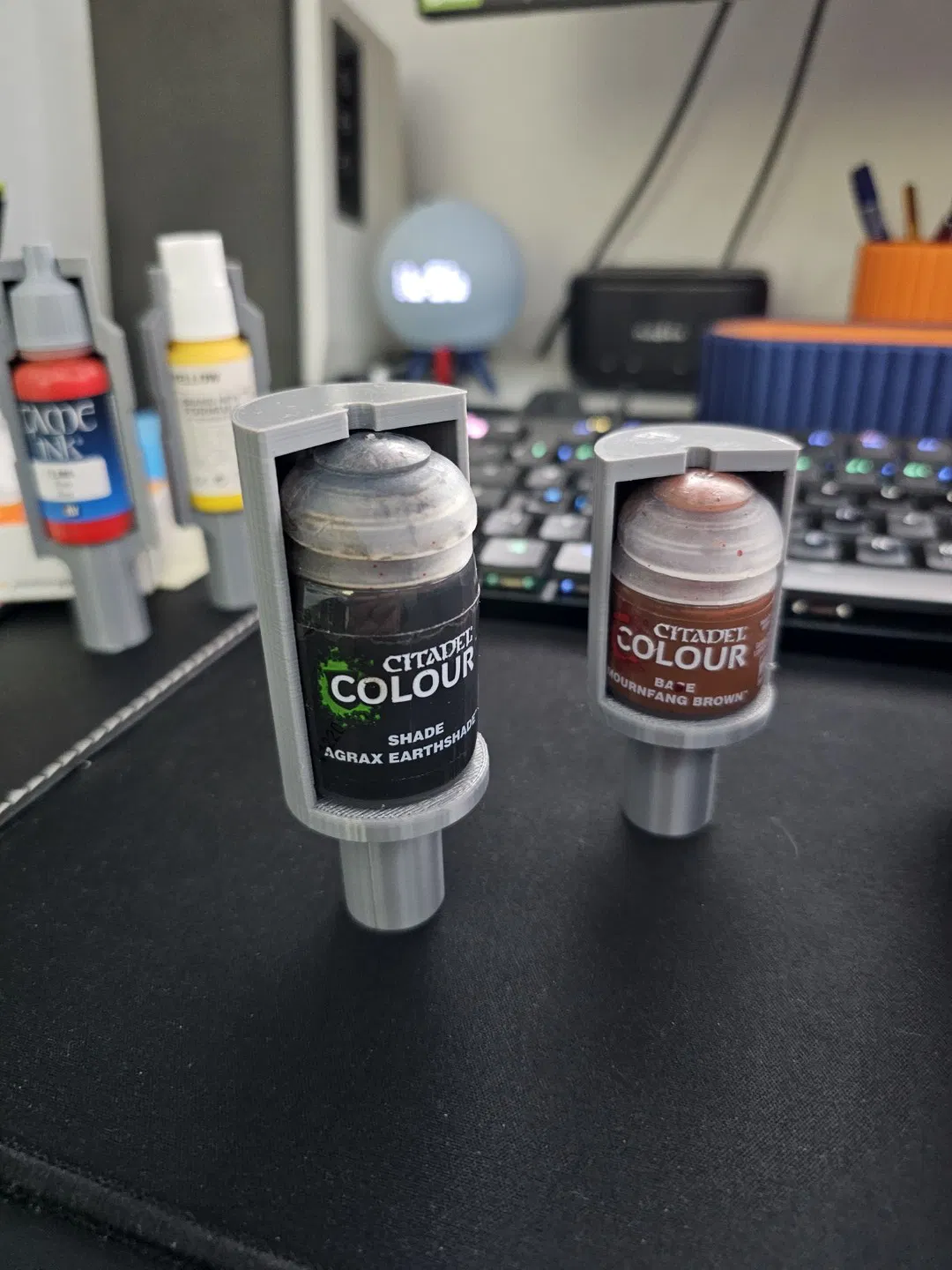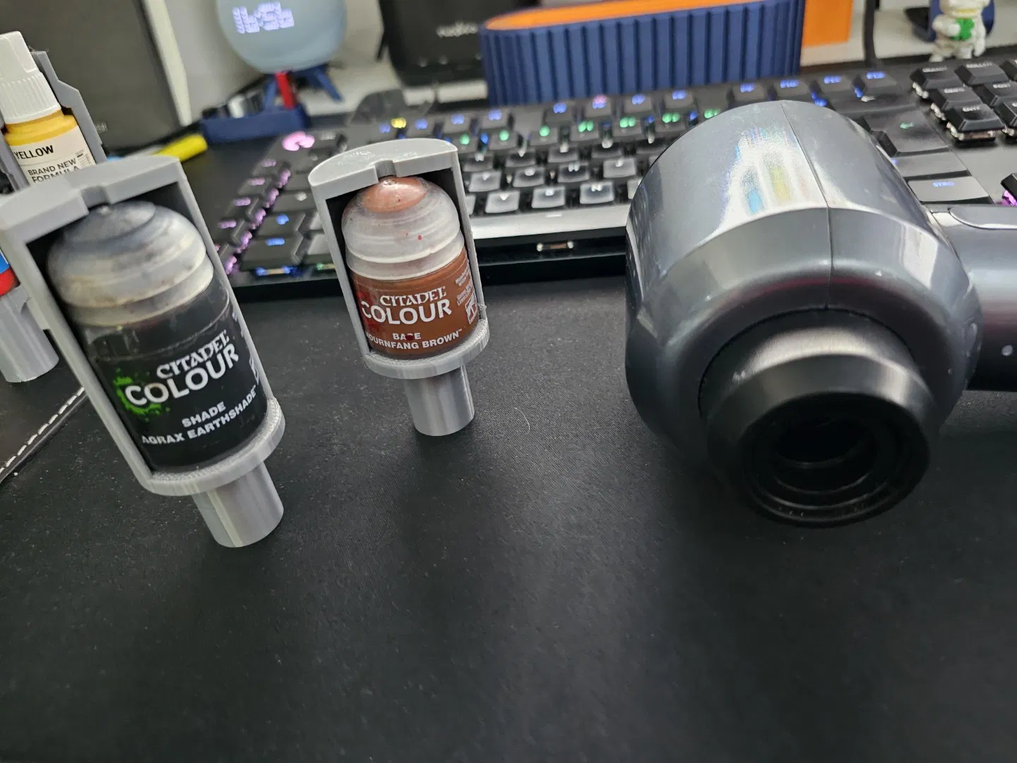 Cái này là cho chai sơn của Vallejo với súng massage có chỗ đựng nhỏ thôi nha. Súng của tui có chỗ 19.1 mm á. Tui có chỉnh lại cái đế với làm thêm phần trên cho 4 loại hũ sơn khác nhau nè. Giờ sơn Citadel loại nhỏ với loại lớn, AK với Vallejo đều xài được hết. Có 4 cục adapter khác nhau nha.