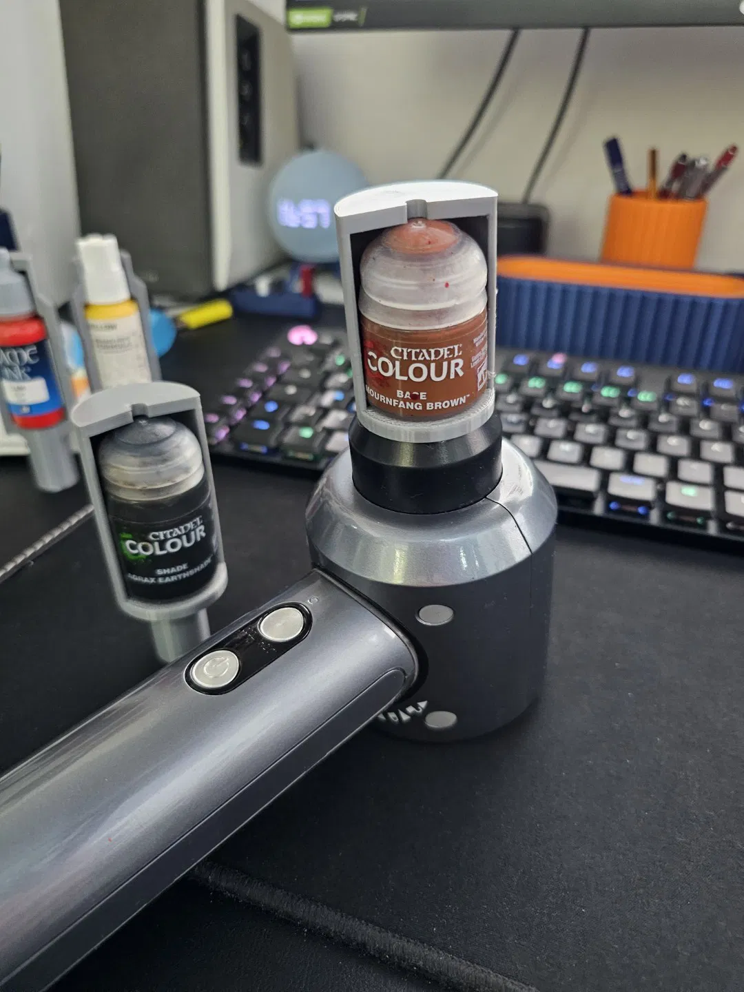 Giá đỡ sơn này được chỉnh sửa lại cho súng massage có chỗ 19.1mm, cho phép bạn gắn các loại hũ sơn Citadel, AK và Vallejo. Bao gồm 4 adapter khác nhau.