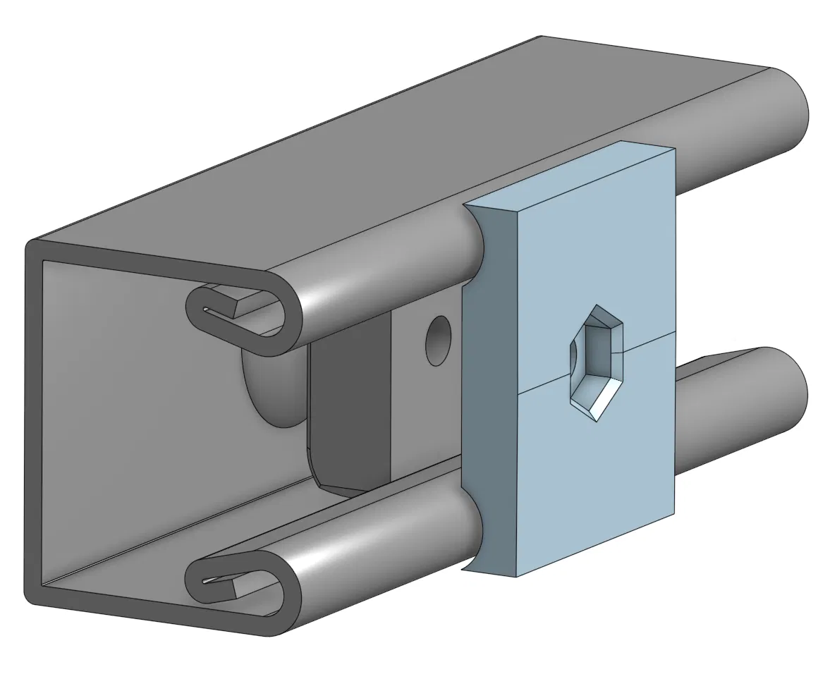 Mô hình này được thiết kế để hoạt động với đai ốc và bu lông M4 tiêu chuẩn, đặc biệt là bu lông m4x25mm. Để sử dụng mô hình hiệu quả, hãy chèn một đai ốc M4 vào mỗi khe. Sau đó, định hướng T-clip sao cho các đai ốc sẽ kéo về phía nhau khi siết chặt, như thể hiện trong hình ảnh này: