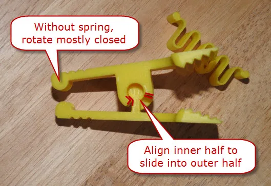 1. Căn 2 nửa khớp lại với nhau ở vị trí gần đóng. Bạn sẽ thấy nửa bên trong có một cái lẫy nhỏ hình quạt sẽ khớp với khe hở ở nửa bên ngoài.