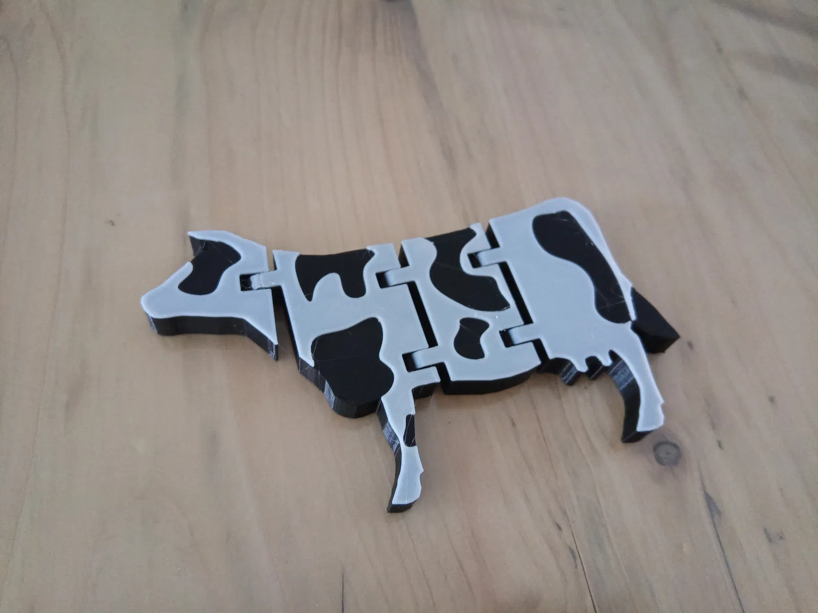 Tôi đã thêm hai phiên bản, một phiên bản chỉ có đường viền của con bò với các khớp nối flexi và một phiên bản với các đốm bò nổi tiếng, nơi bạn phải thay đổi vật liệu trong quá trình in.