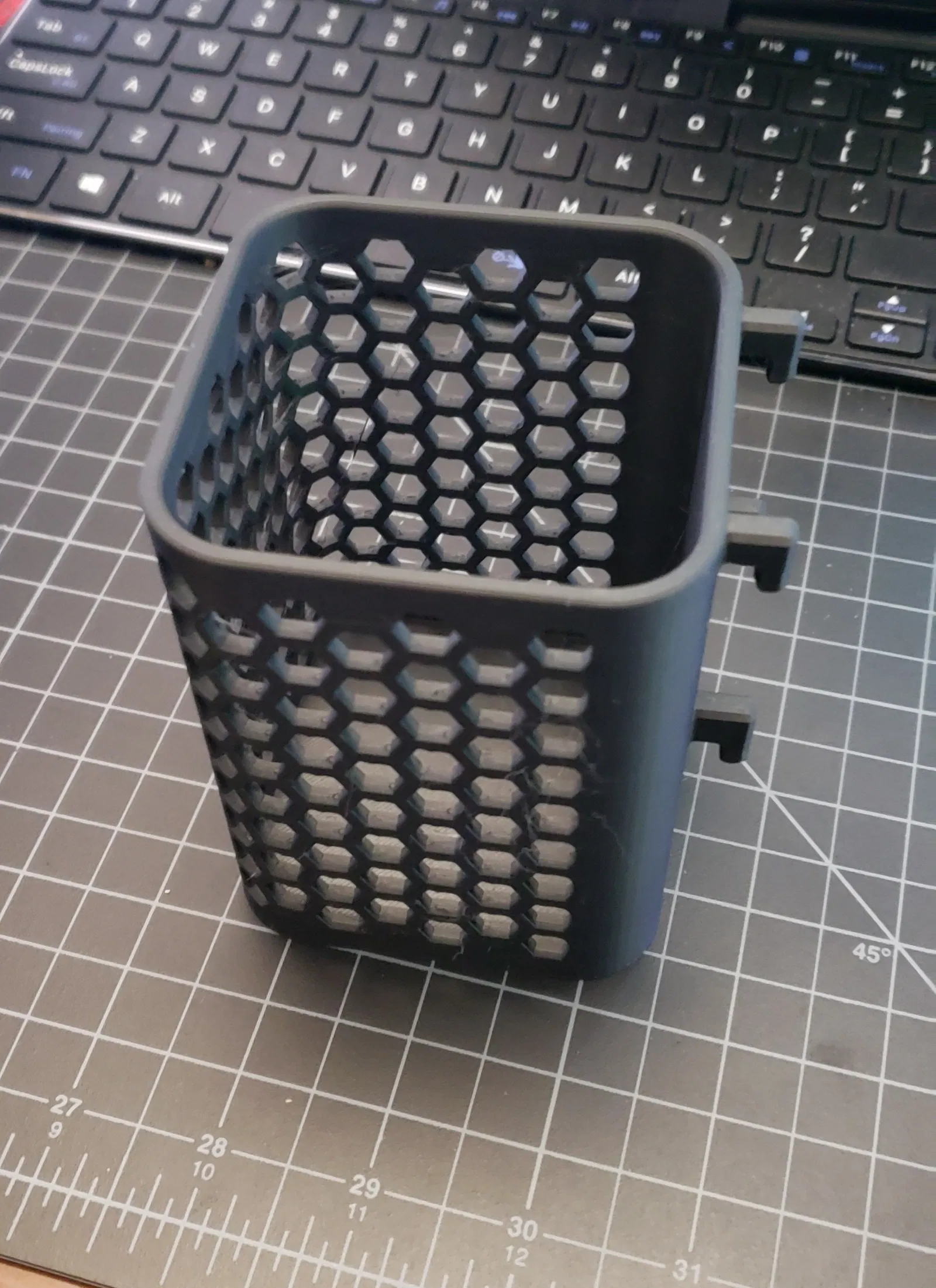 - Tui chỉ vẽ thêm một vài cái tree support dạng hữu cơ bên dưới phần đầu móc và phần cầu nối từ hộp đựng tới móc. Sau khi in xong thì dễ dàng tháo bỏ.