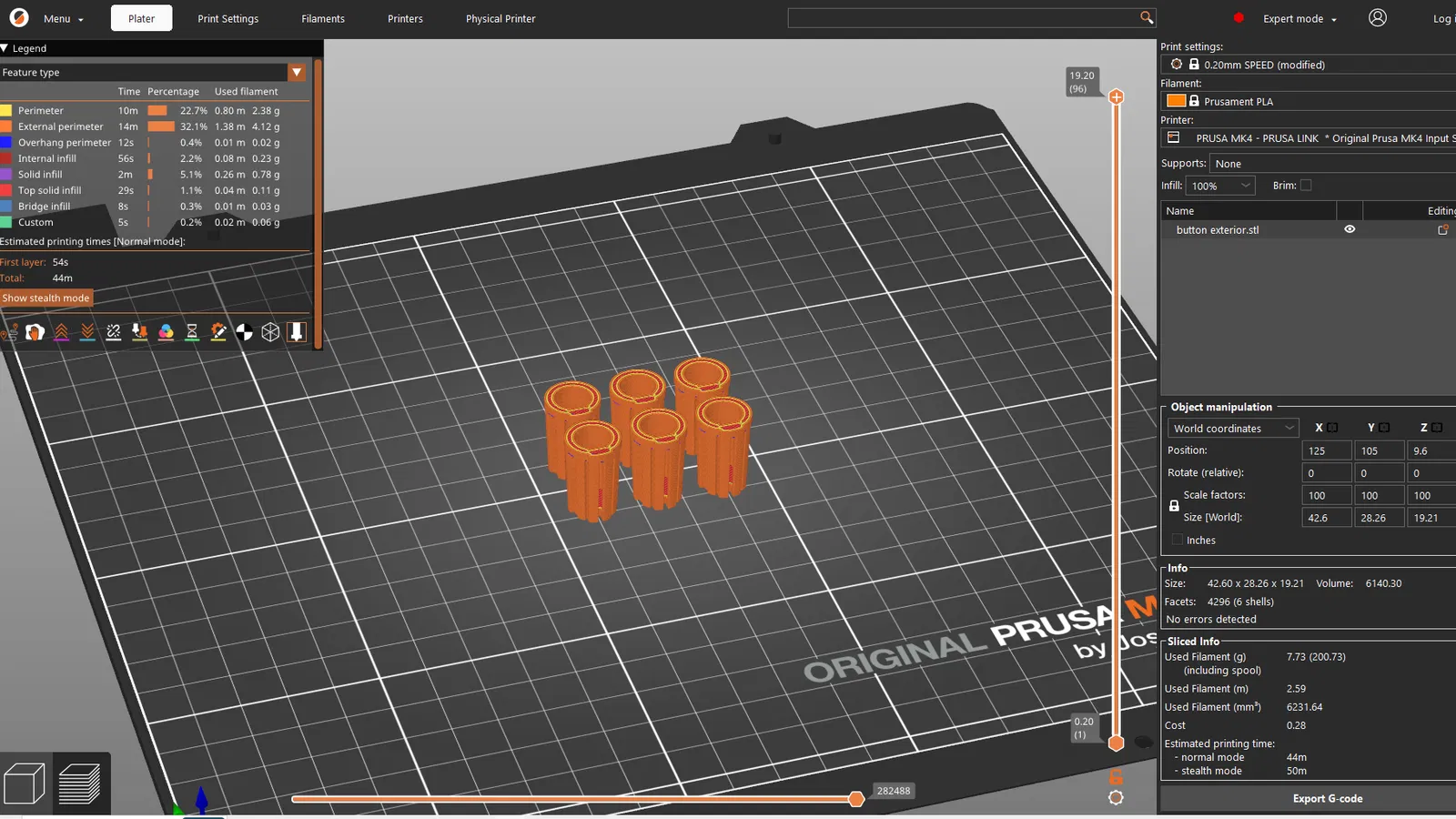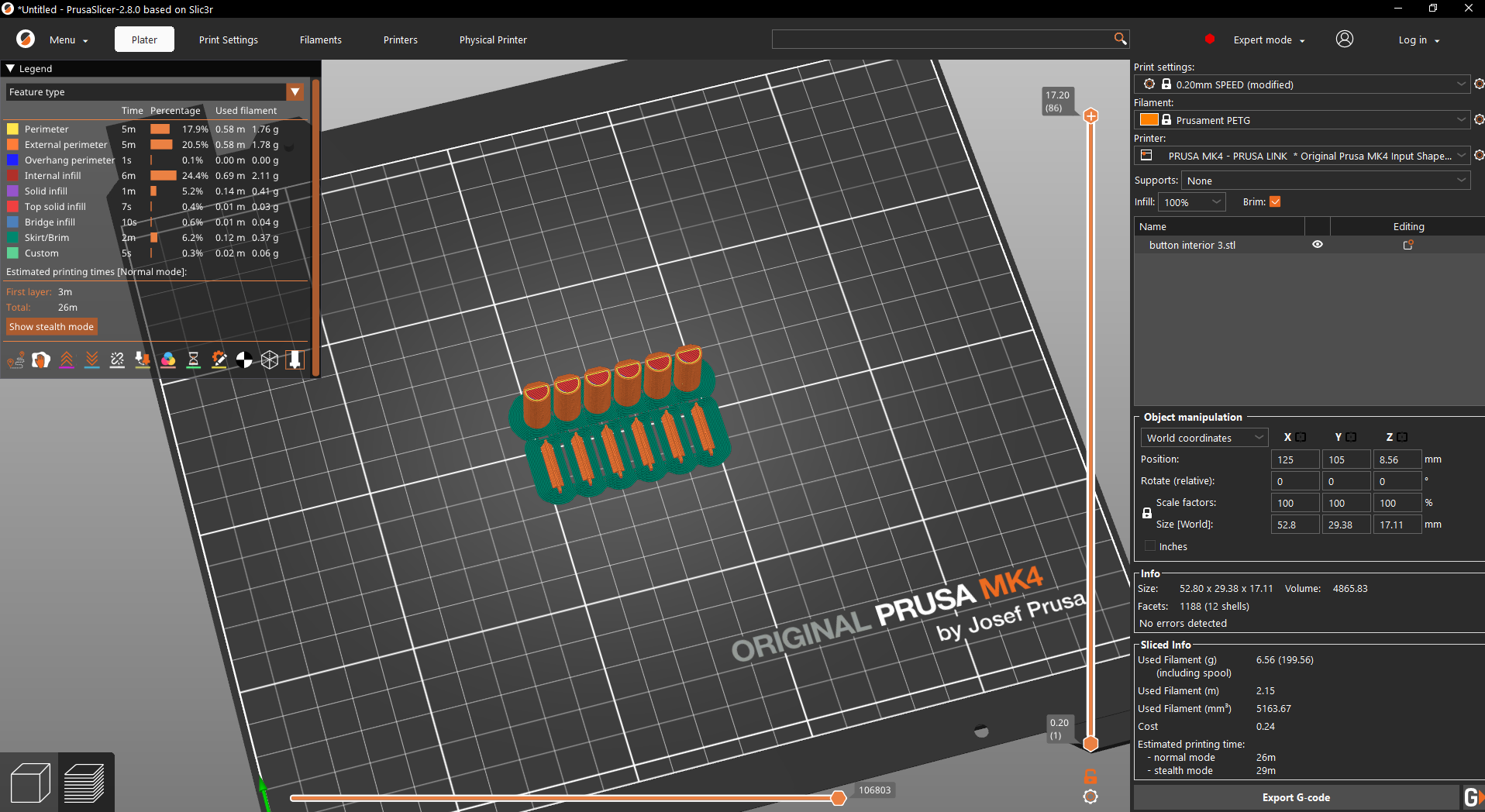 Tất cả các bộ phận được in với lớp dày 0,2mm và mật độ điền 15%, cùng với các cài đặt tiêu chuẩn cho cả hai loại sợi nhựa Prusament. Sử dụng vành (brim) cho các bộ phận nhỏ bằng PETG, nhưng tùy chọn.
