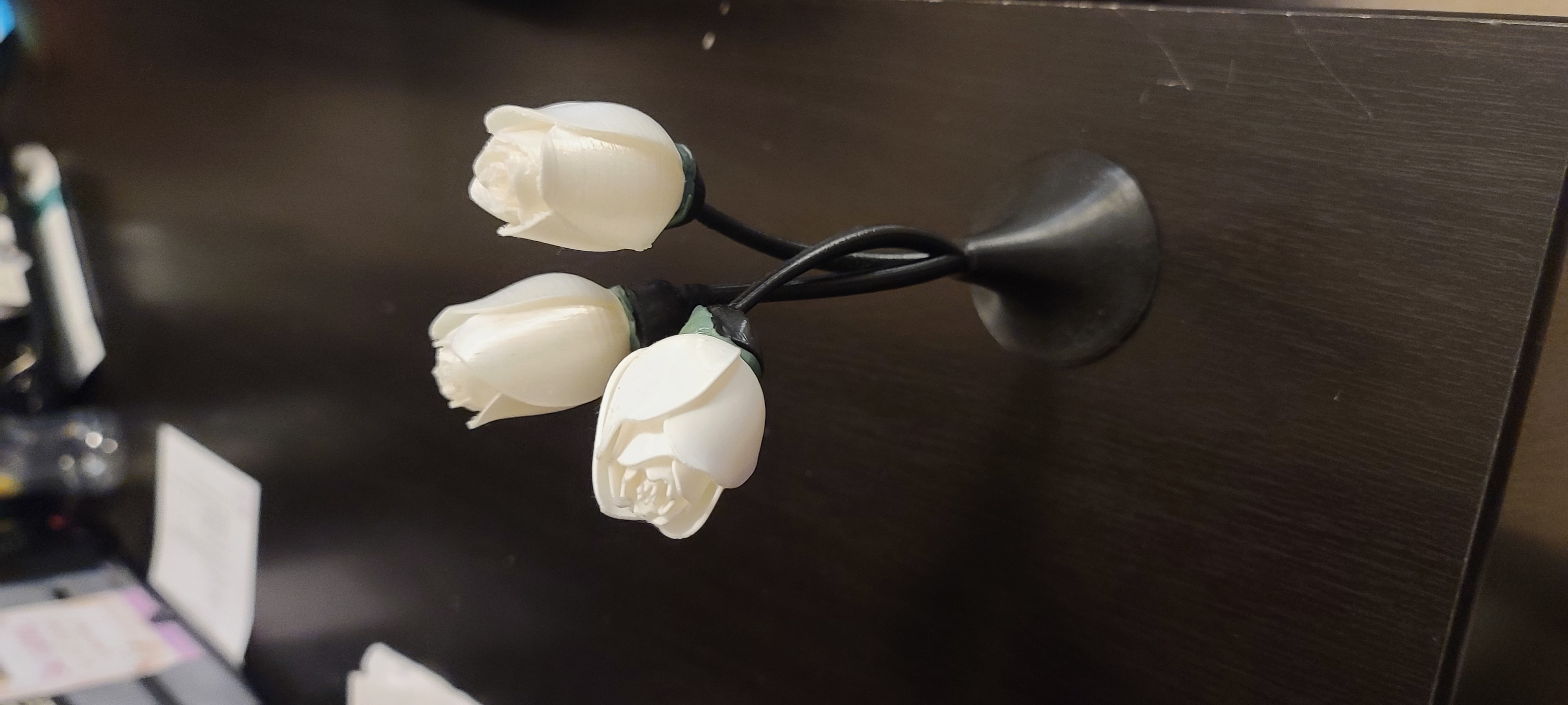 Kết hợp cành hoa hồng trang nhã từ mẫu đầu tiên với bông hoa hồng khép trang nhã từ mẫu thứ hai. Tui đã in phần thân bằng PLA đen, bông hoa bằng PLA trắng ngọc trai và trắng trong mờ. Sử dụng Green Stuff để tạo lá và dán hoa lên cành.