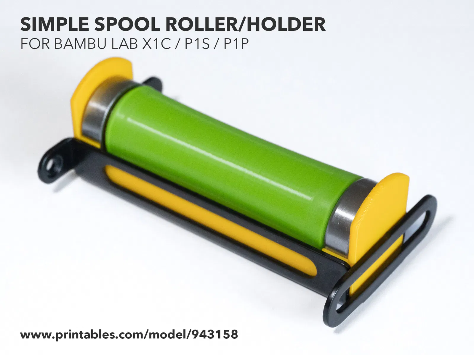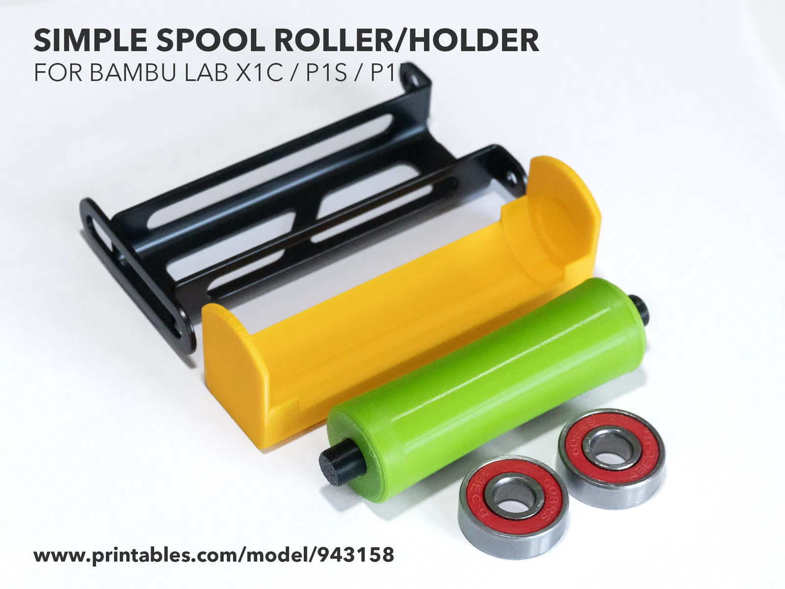 Con lăn/giá đỡ cuộn dây in nhanh, dễ lắp ráp cho máy in 3D Bambu Lab X1C, P1S, P1P. Chỉ cần 2 viên bi 608 và bracket kim loại có sẵn. File Fusion 360 và STEP đi kèm để tùy chỉnh.