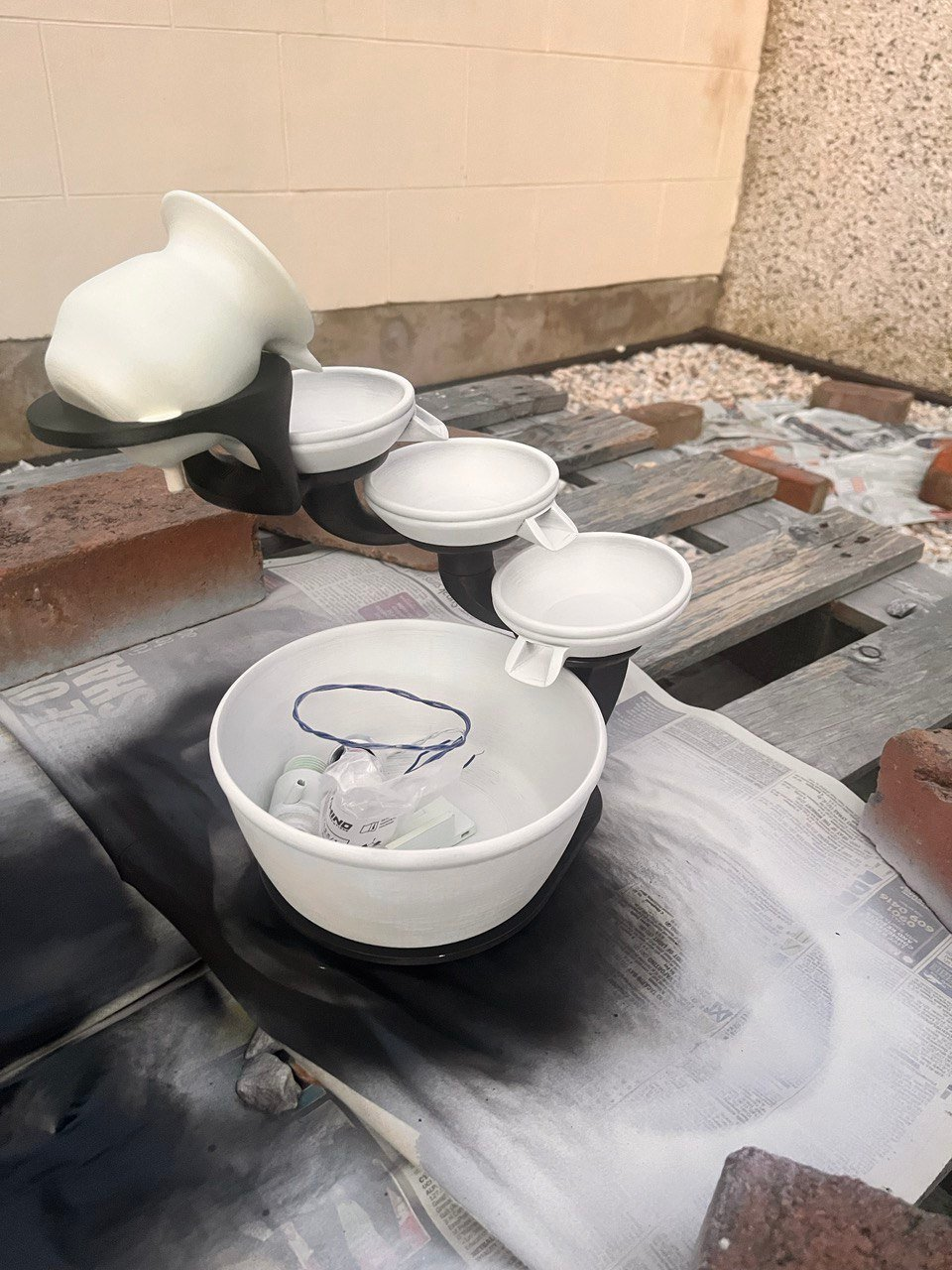 Đài phun nước nhiều bát in 3D, bao gồm các bộ phận in, máy bơm và điện tử tùy chỉnh. Lưu ý: nên dùng nhiều lớp sơn chống thấm nếu in bằng PLA, hoặc cân nhắc dùng PETG. Hướng dẫn in và sơn chi tiết.