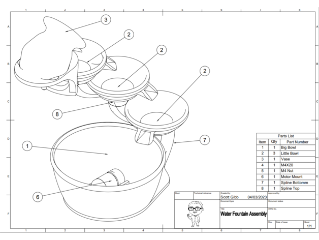 Đài phun nước in 3D. Đài phun nước bao gồm bảy bộ phận in 3D, hai thân, ba bát nhỏ, một bát lớn và một bình. Nó được thiết kế theo cách này để tạo hiệu ứng nước chảy. Thiết kế sử dụng máy bơm 3D 30mm đã được thiết kế trước đó.