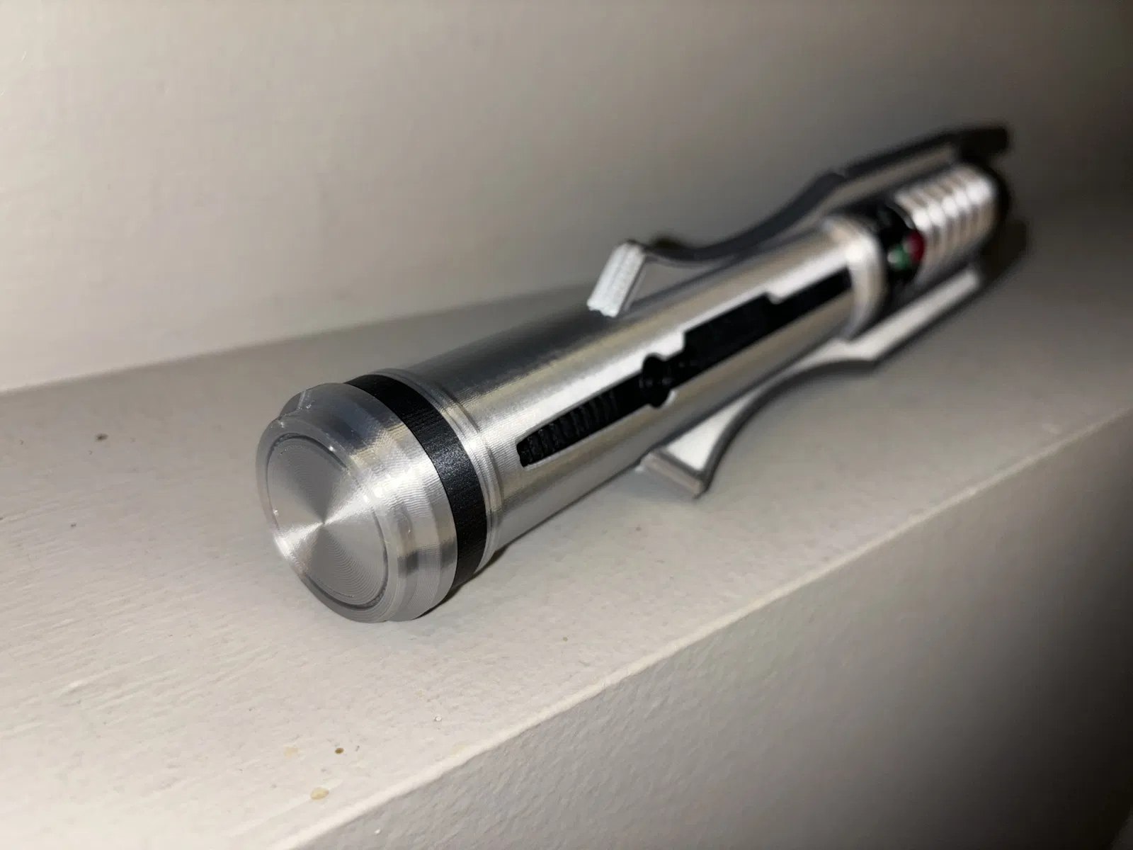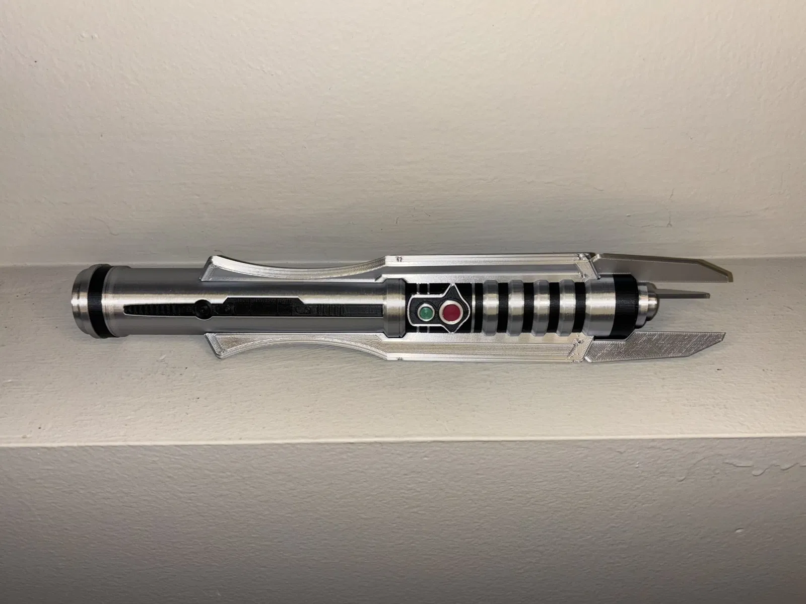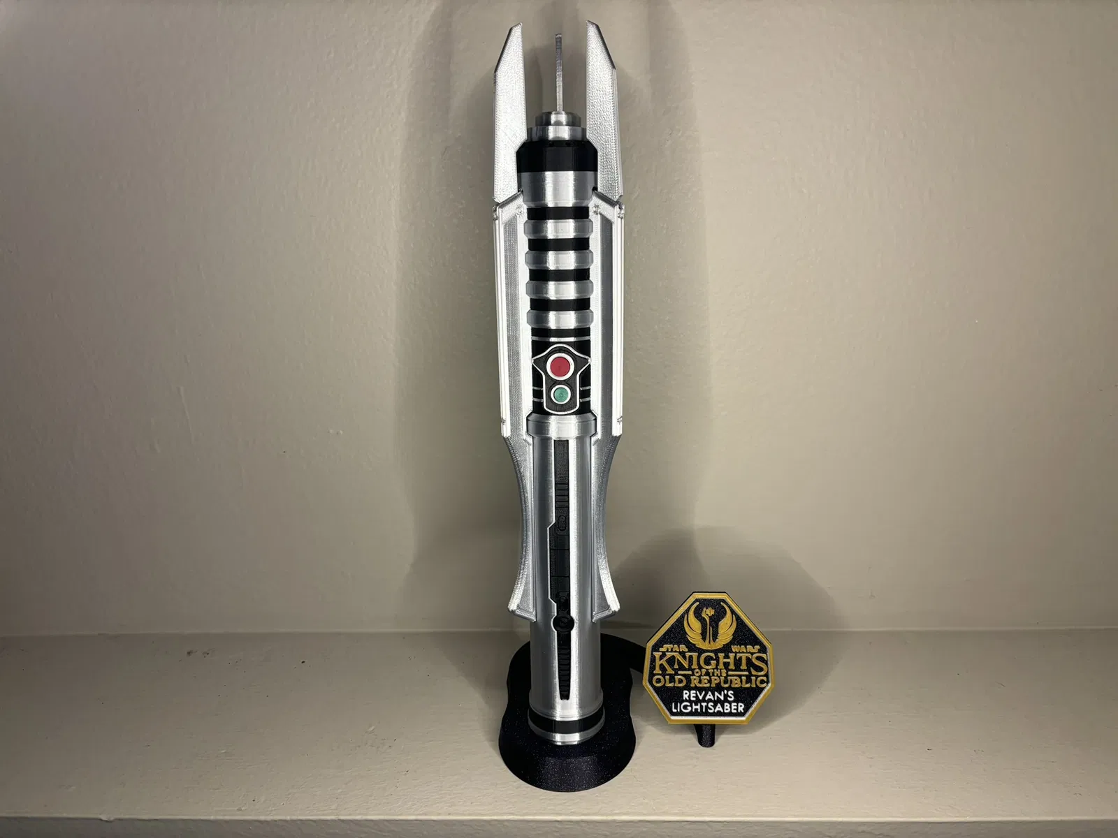 Tự tay làm cây lightsaber huyền thoại của Revan từ game Knights of the Old Republic kinh điển. Bản thiết kế chi tiết với các bộ phận có thể in 3D, kèm đế trưng bày. Dùng filament PLA Ziro silk silver và Overture matte black.
