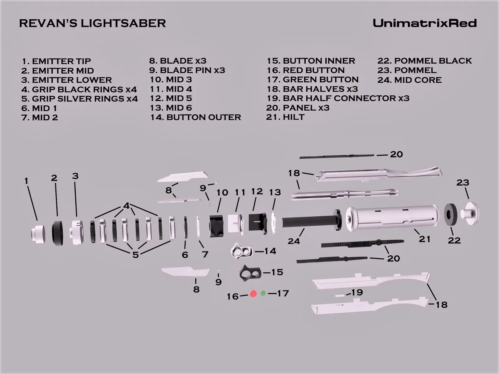 Đây là bản thiết kế của tui cho cây lightsaber chính của Revan. Anh em xem hình để biết cách lắp ráp nha.