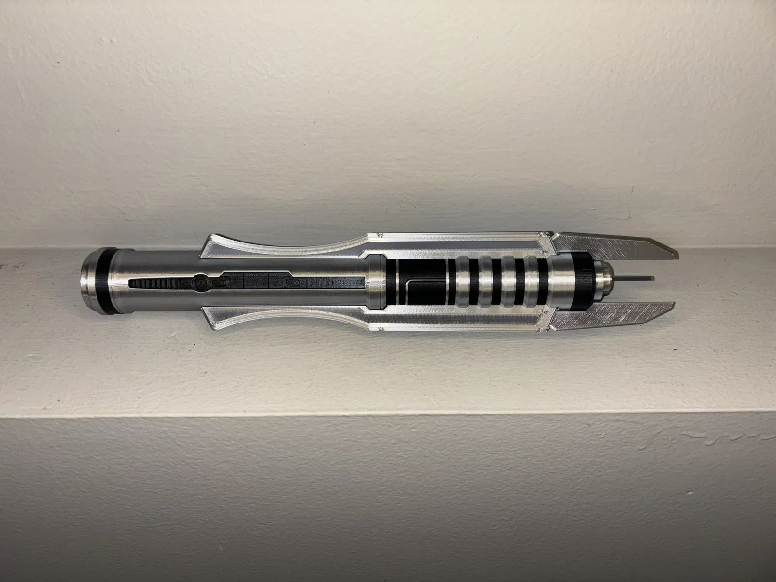 - Nửa thanh kiếm có một miếng nối để dễ dàng định vị. Lưỡi kiếm có thể di chuyển ở phần phát sáng có thể được gắn bằng chốt bản lề in 3D hoặc anh em có thể dùng sợi filament để thay thế.
