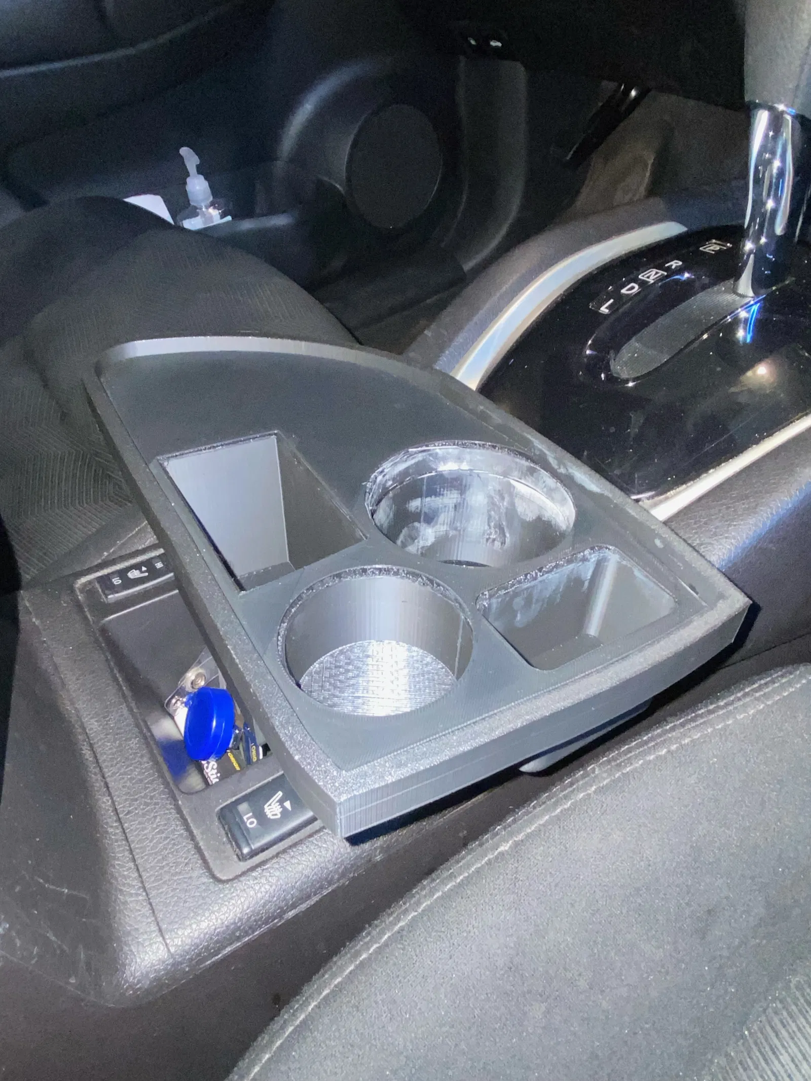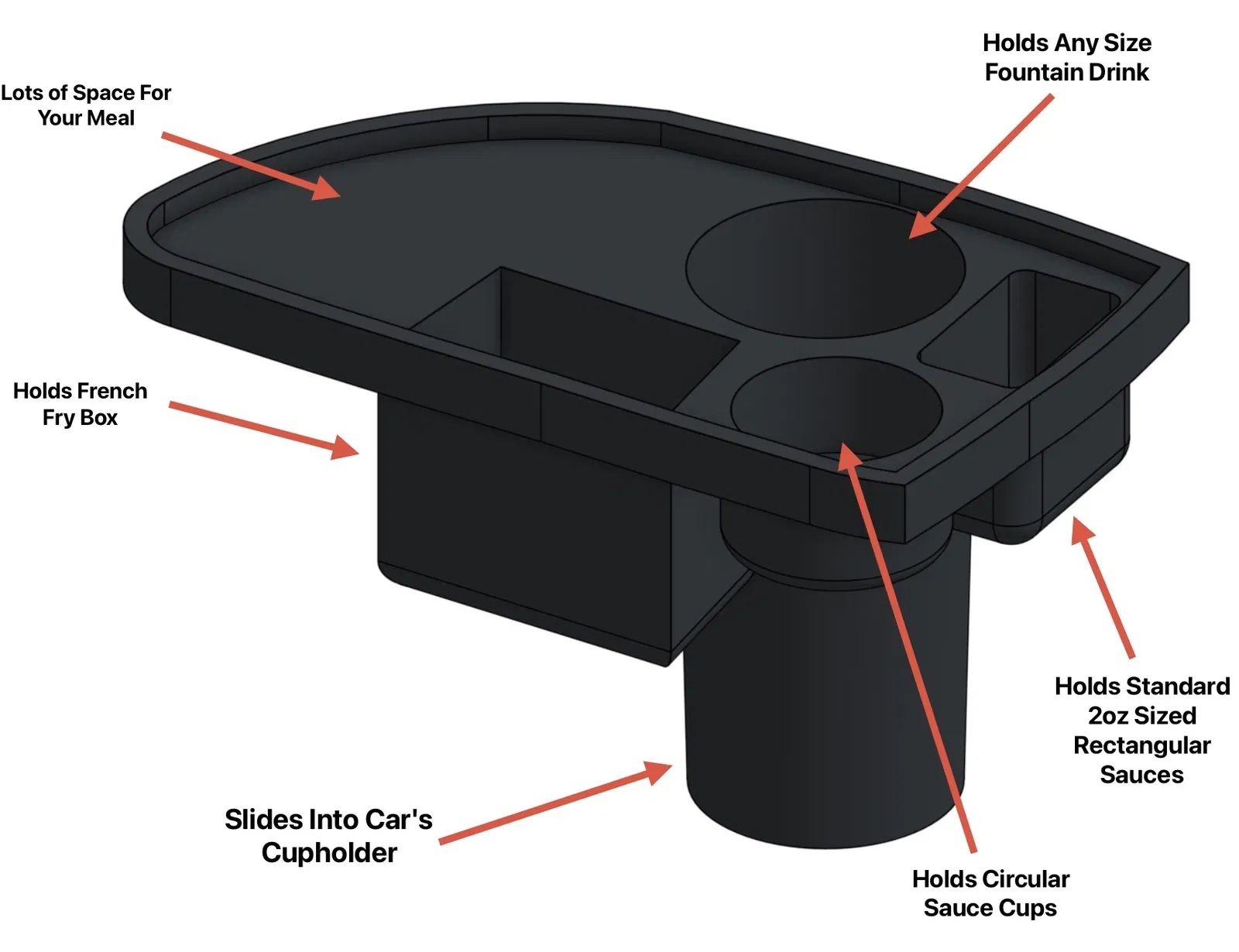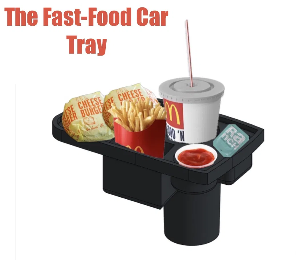 Cái khay đựng đồ ăn nhanh này gắn vô chỗ để ly nước trên xe, có chỗ để nước ngọt, tương cà, khoai tây chiên, với đồ ăn chính. Ăn uống trên xe sạch sẽ, tiện lợi.