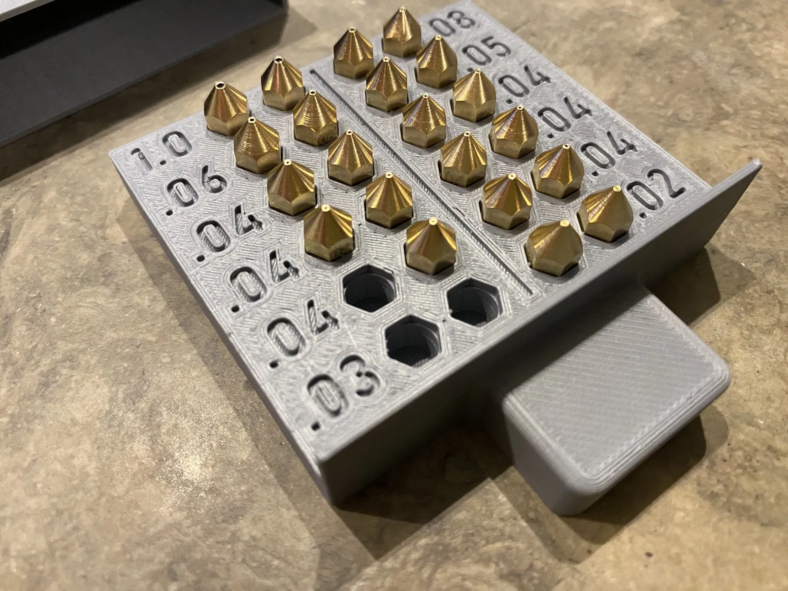 Hộp đựng này có thể chứa tới 24 đầu phun, có nhãn kích cỡ từ 0.2 đến 1.0 và được thiết kế đặc biệt cho đầu phun MK8. Mô hình in không cần hỗ trợ và có nhãn kích cỡ đầu phun đã được sửa đổi.