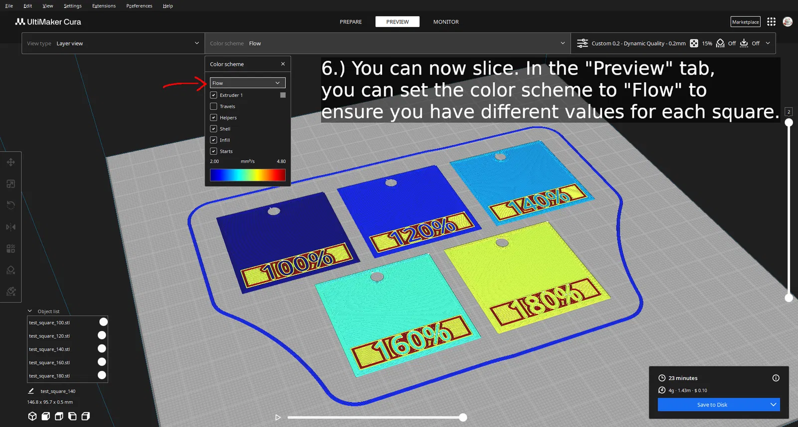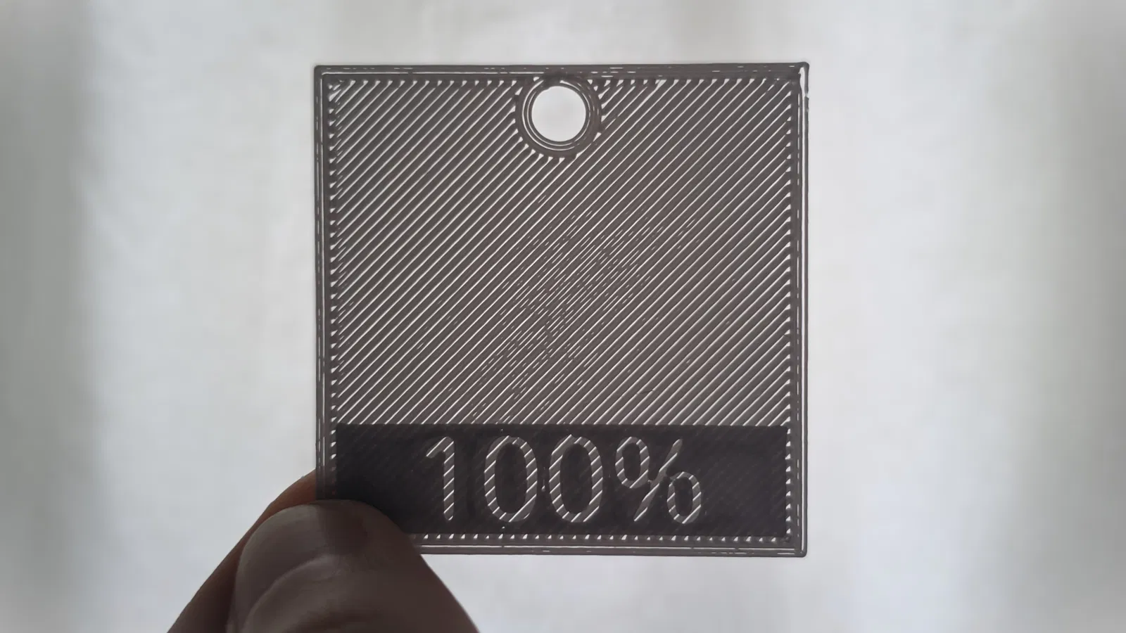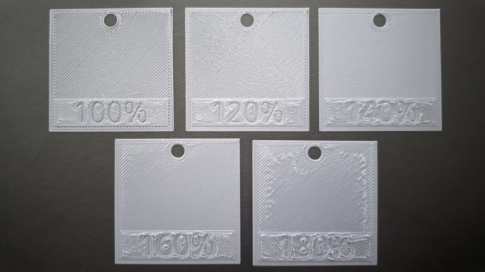 Mỗi ô vuông được dán nhãn với các giá trị tăng dần 5%, bắt đầu từ 100 và lên đến 200 (tui có thể thêm các giá trị dưới 100 sau này). Chỉ cần thay đổi cài đặt dòng chảy lớp đầu tiên của bạn để khớp với số trên ô vuông. Bằng cách này - và với việc có một lỗ nhỏ ở trên cùng - chúng có thể được cất giữ trên móc khóa để tham khảo trong tương lai.