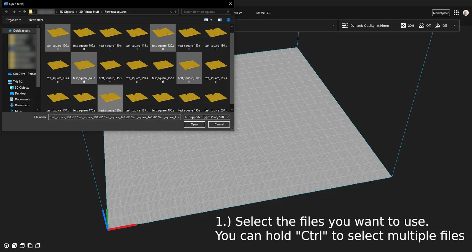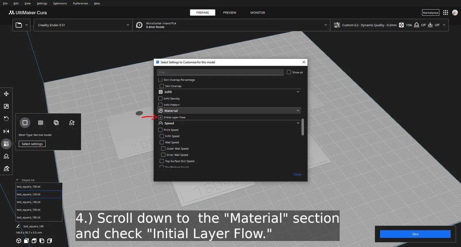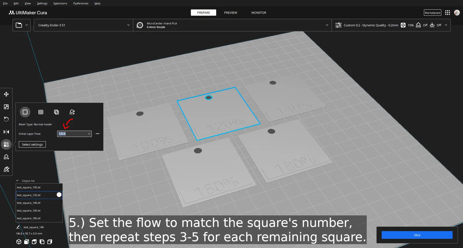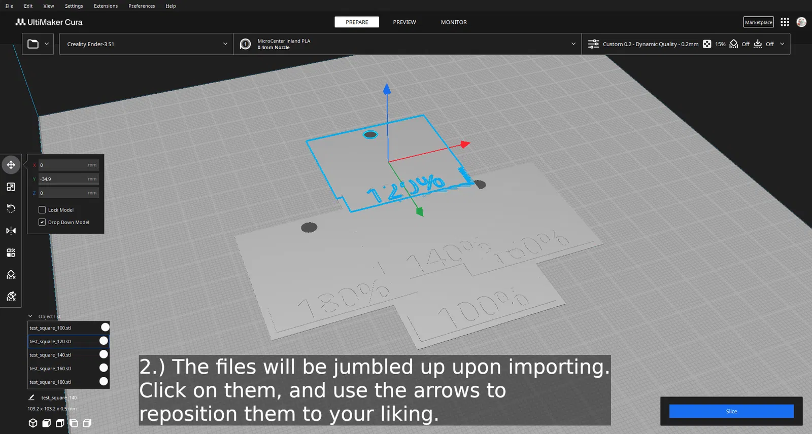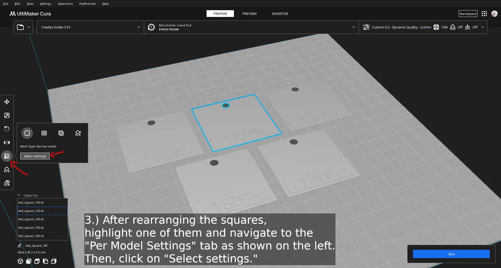 1.) Những ô vuông này được thiết kế với chiều cao lớp là 0.2mm, dù bạn có thể dùng giá trị nhỏ hơn, miễn là phần chính của ô vuông vẫn dày một lớp.