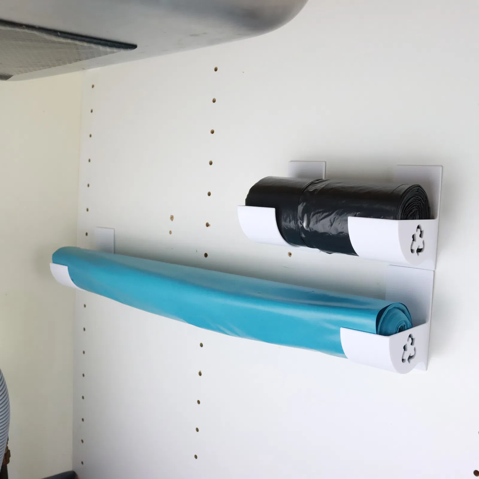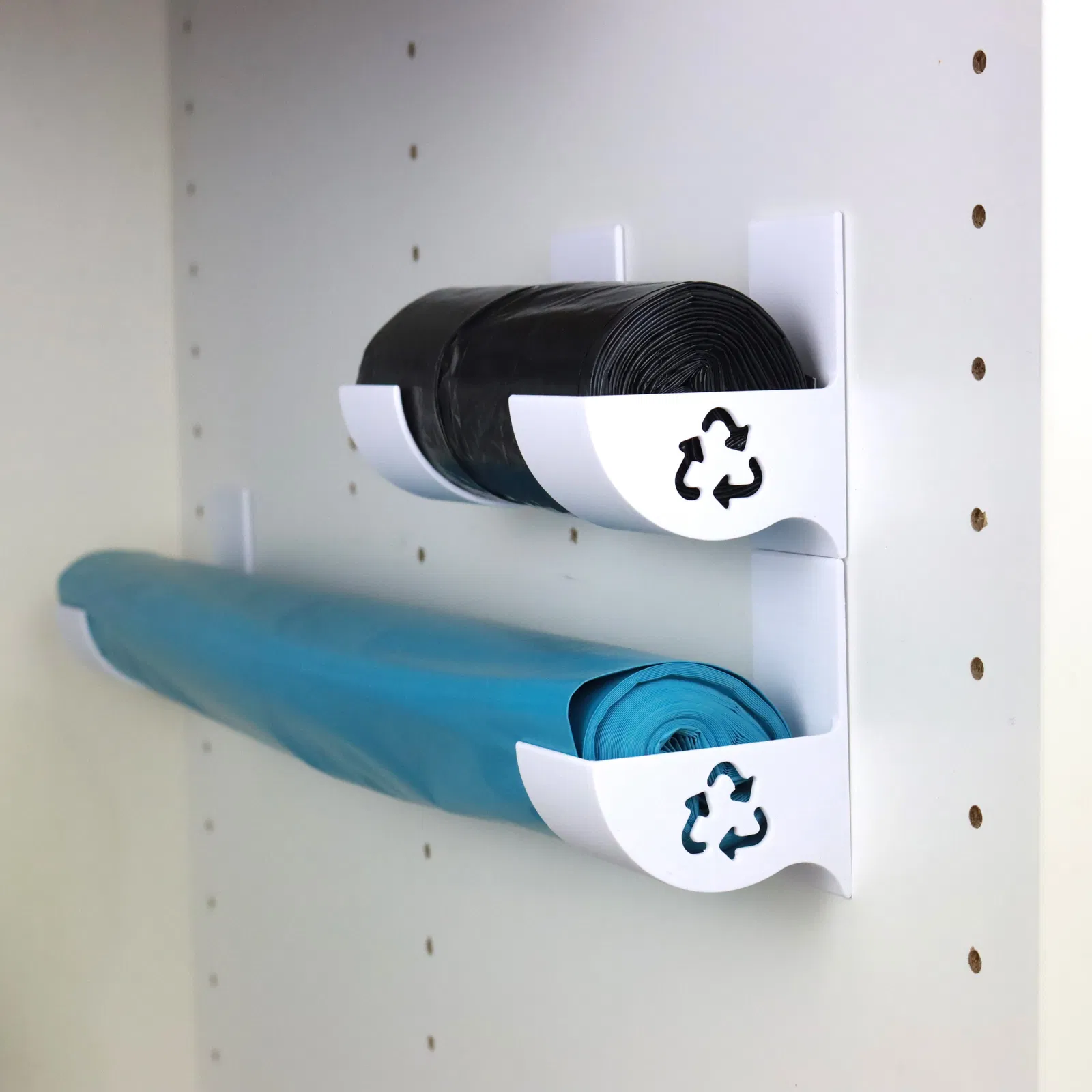 Không tìm được chỗ đựng bịch rác ưng ý, tui tự thiết kế ba phiên bản: dán băng keo, bắt vít, và cho bảng SKÅDIS. Hỗ trợ đường kính cuộn tối đa 67 mm, có bản XL. Ghé manicken.se nếu ở Thụy Điển.