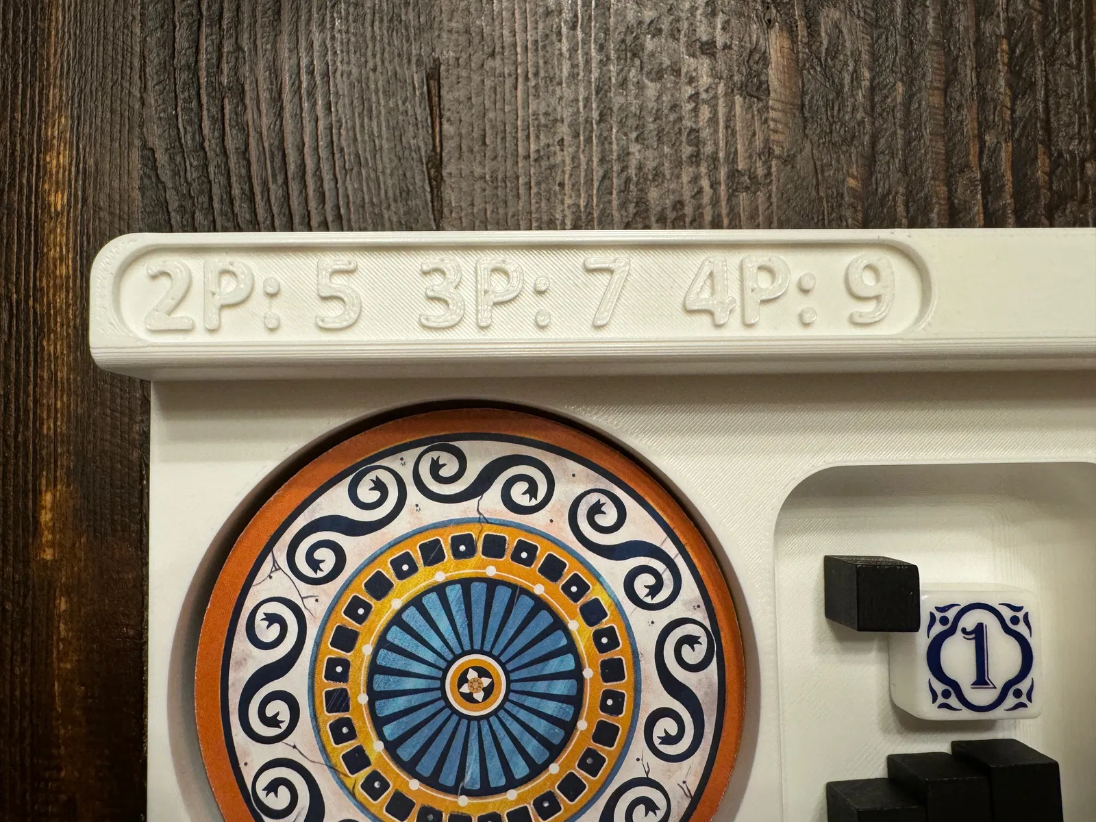 Tôi không thích các lớp phủ đi kèm với bản mở rộng Crystal Mosaic, vì vậy bộ chèn này thay vào đó bao gồm các lớp phủ cho phần bảng điểm của bảng người chơi. Để giúp giữ các lớp phủ bảng điểm đúng vị trí, tôi đã thêm một vài kẹp vào các thiết kế được đăng trên Thingiverse bởi Pezmc, người đã phối lại thiết kế của Bibliophiled.