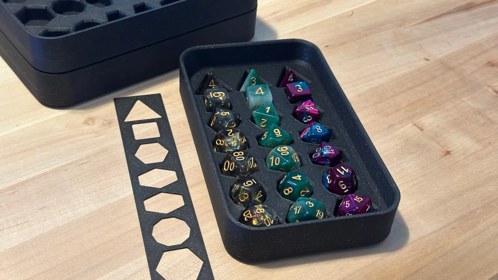 Cái hộp đựng xúc xắc này được thiết kế để chứa ba bộ 7 viên xúc xắc, xếp mặt ngửa lên trên. Nó cũng được thiết kế để xếp chồng lên nhau, nên bạn có thể có nhiều bộ được sắp xếp gọn gàng.