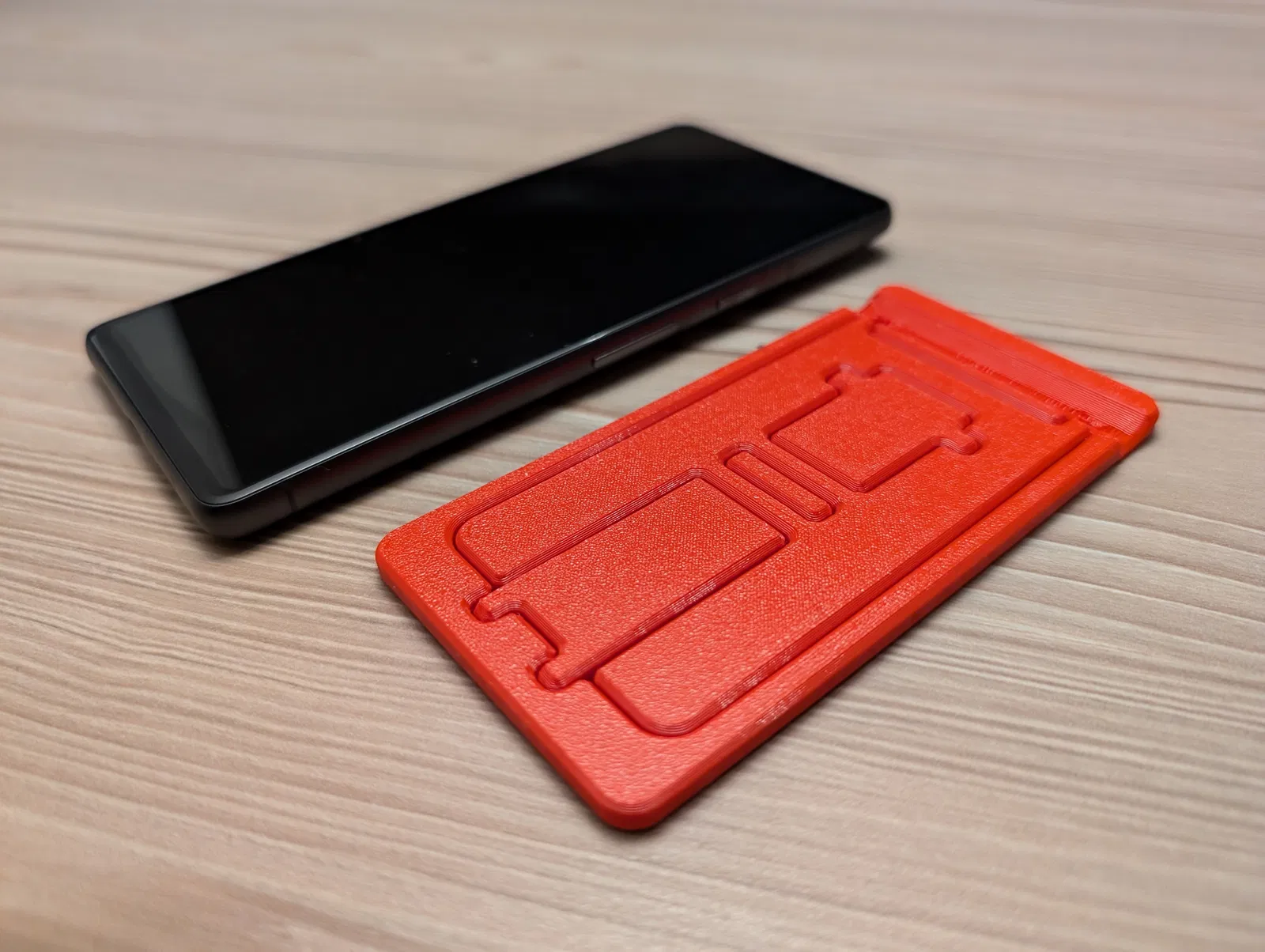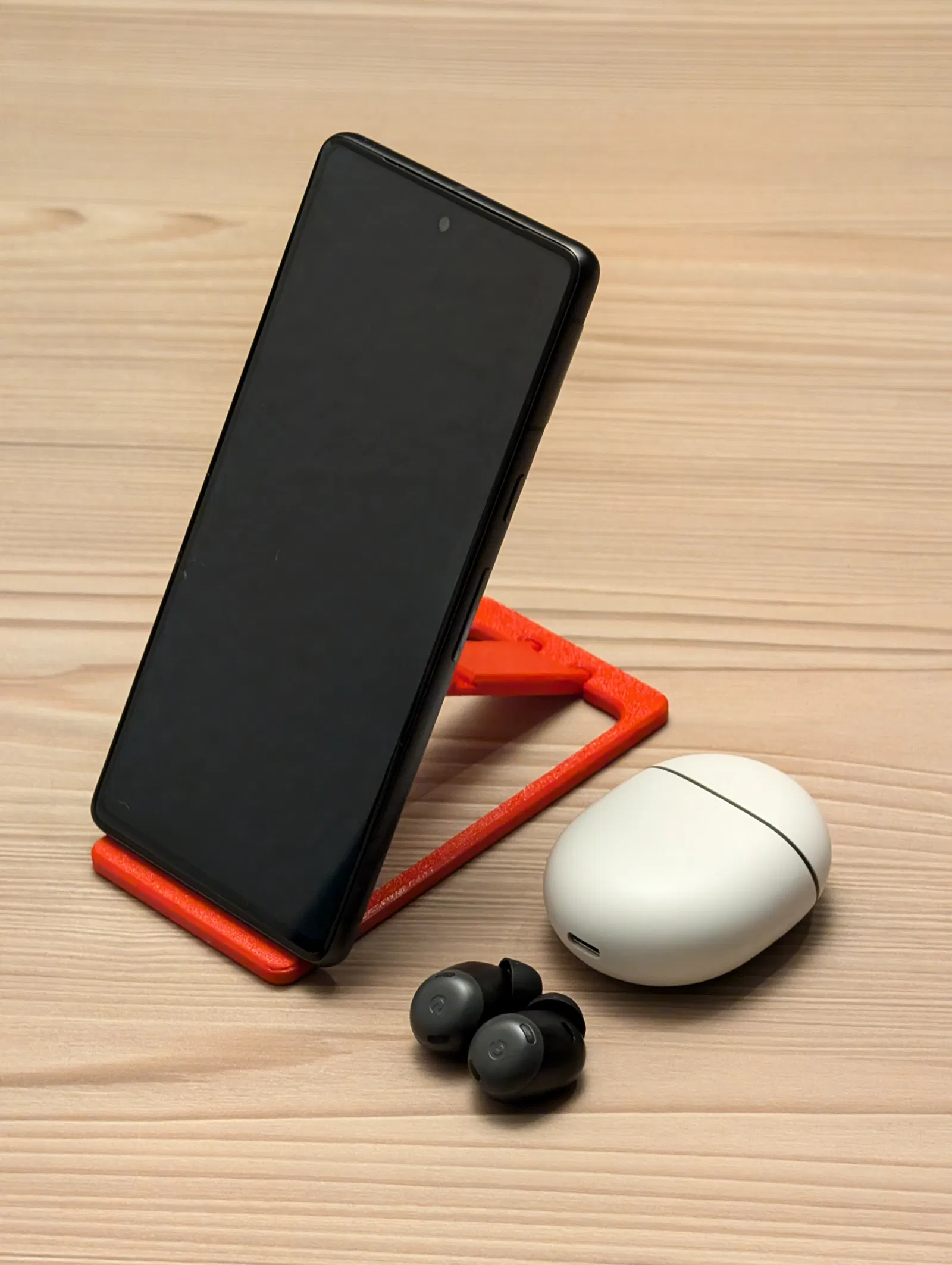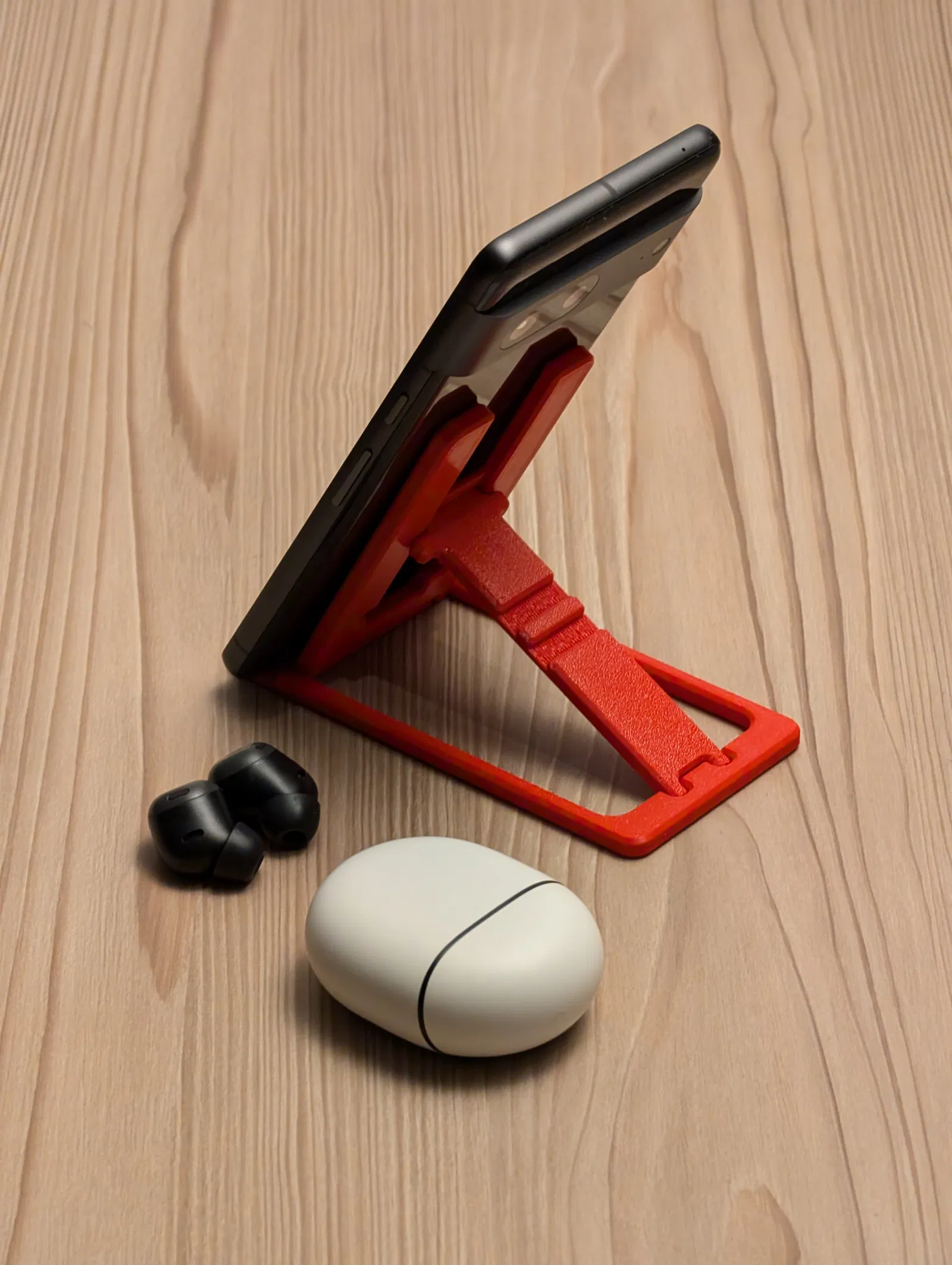 Chân đế điện thoại được thiết kế xếp gọn để tiết kiệm không gian. Dài 120 mm, rộng 60 mm. Lý tưởng cho việc mang đi lại hoặc cất giữ gọn gàng khi không sử dụng. Mô hình được in bằng PETG đỏ son Prusament.