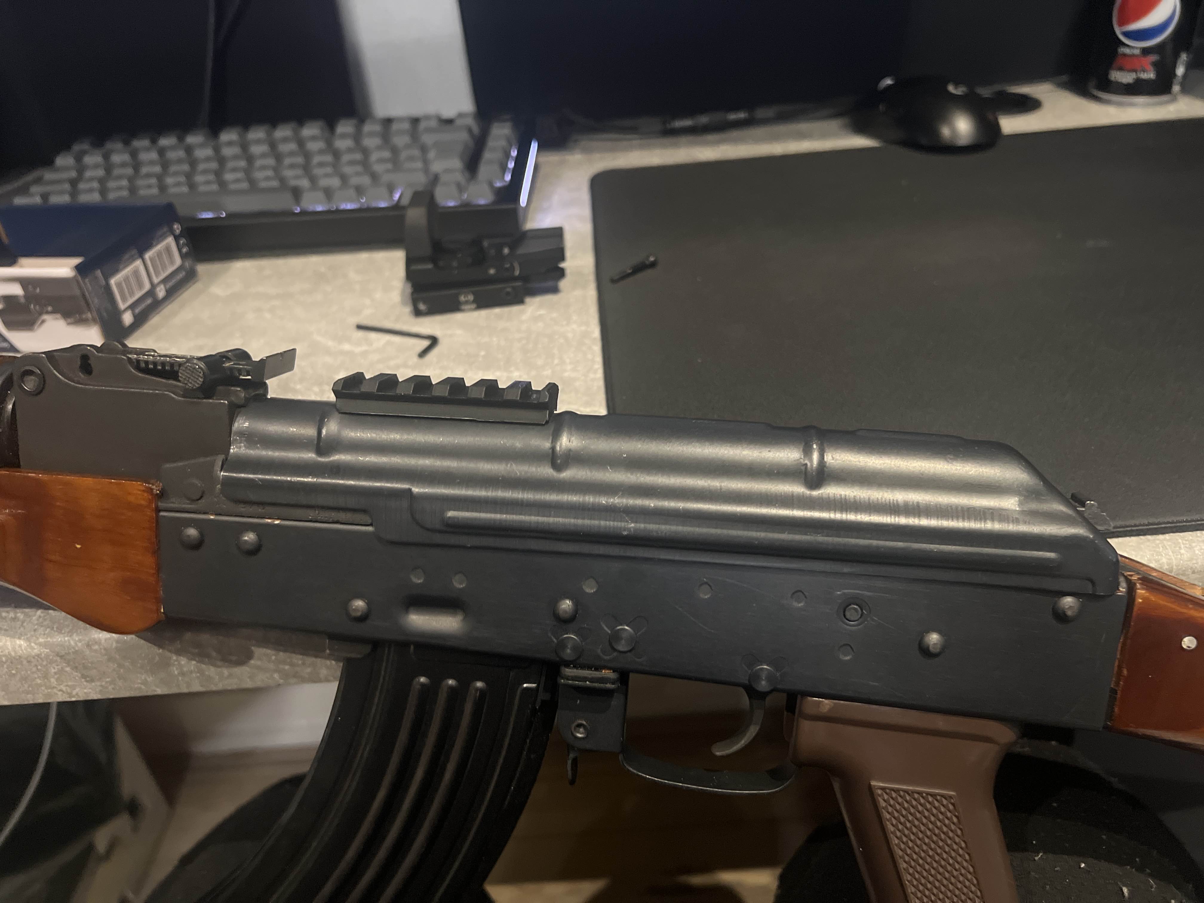 Mod thanh ray picatinny cho AK. Bạn cần khoan 2 lỗ trên nắp che bụi hoặc tìm nắp che bụi từ AK74-U rồi khoan 3 đinh tán ra, các lỗ sẽ thẳng hàng với 2 lỗ. Tôi in bằng đầu phun 0.4mm, chiều cao lớp 0.16mm và 100% độ đặc ruột.